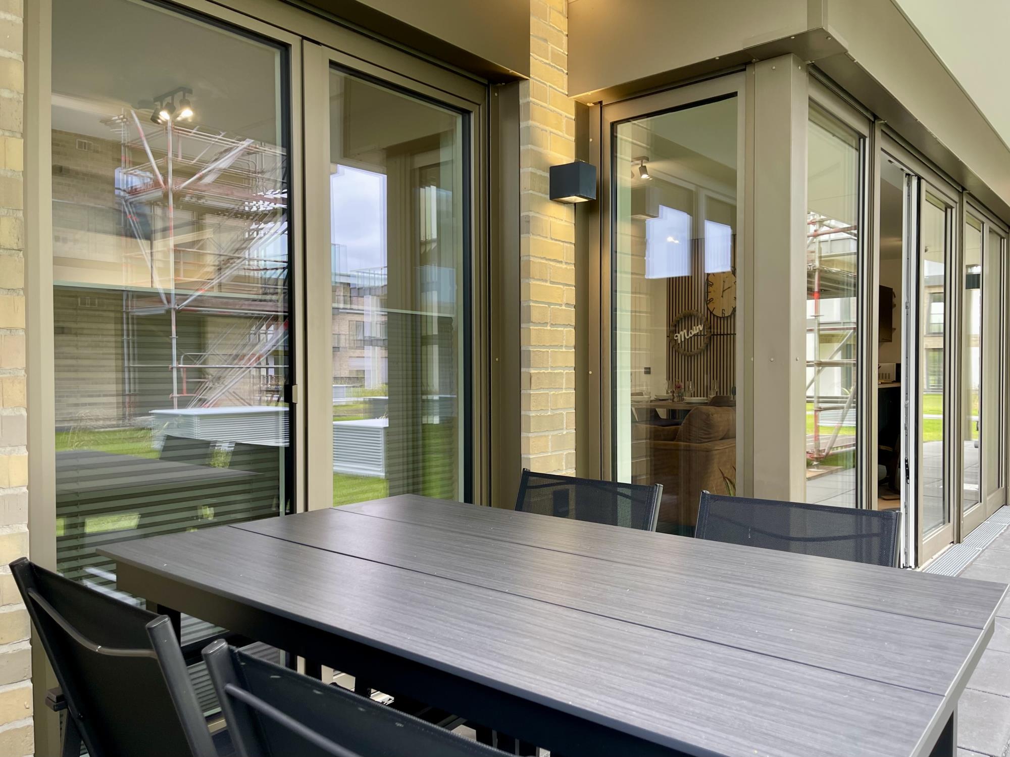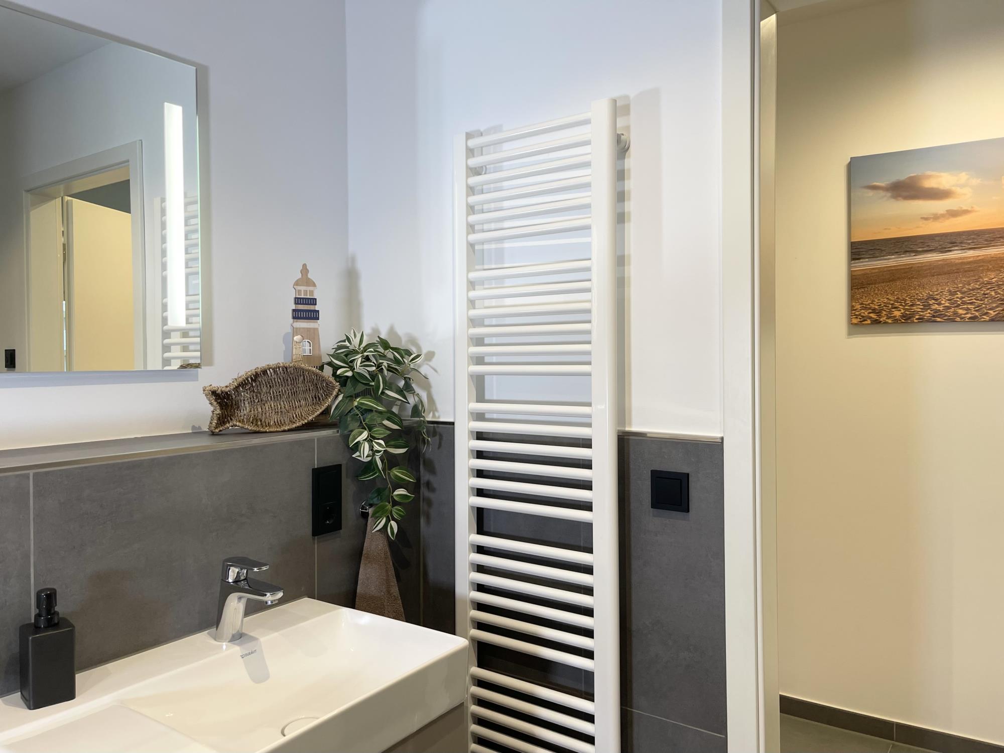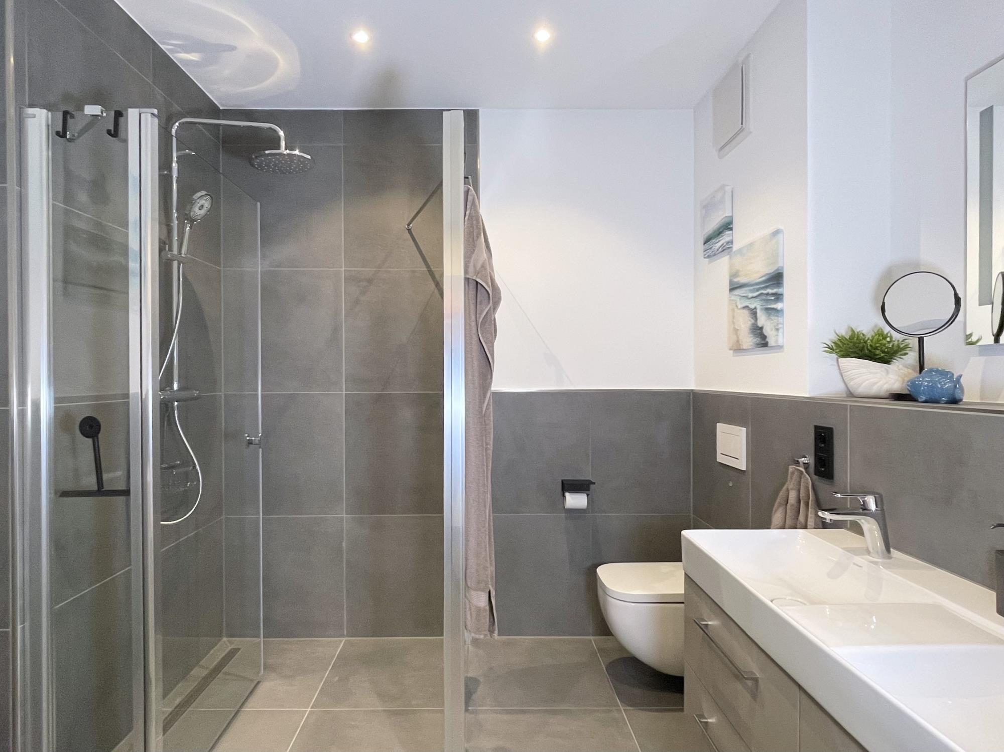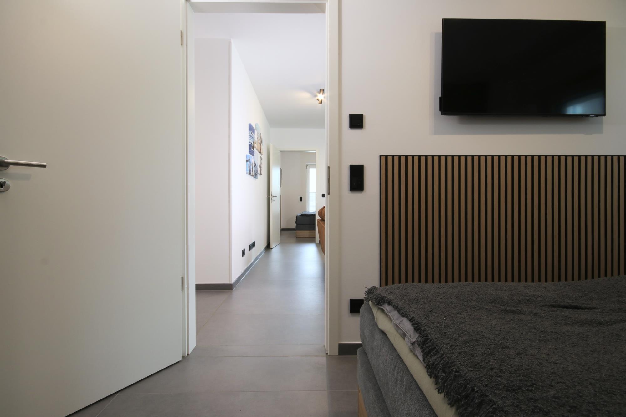 Der moderne und top-ausgestattete offene Küchenbereich ist clever in den Ess- & Wohnbereich integriert. Von hier aus sind das Bad, mit bodengleicher Dusche, die Saunaräumlichkeit (Infrarotsauna), zwei Schlafzimmer und die Terrasse zugänglich, von der es einen herrlichen Ausblick bis zur Nordsee gibt.
