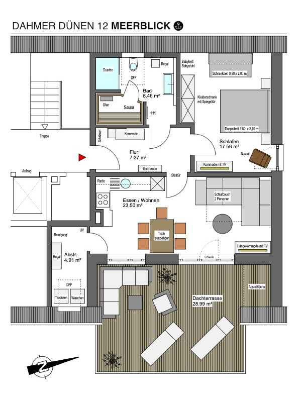 Herzstück der Wohnung ist die riesige 30 m² große Dachterrasse mit gemütlicher Sitzgruppe und 2 Sonnenliegen. Hier können Sie ungestört die Sonne genießen und haben einen fantastischen Blick über die Dächer von Dahme.