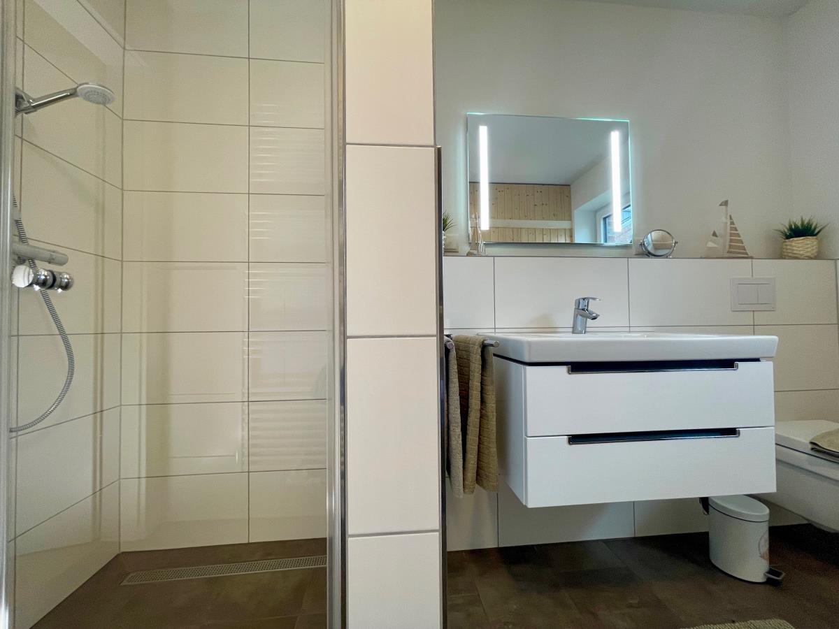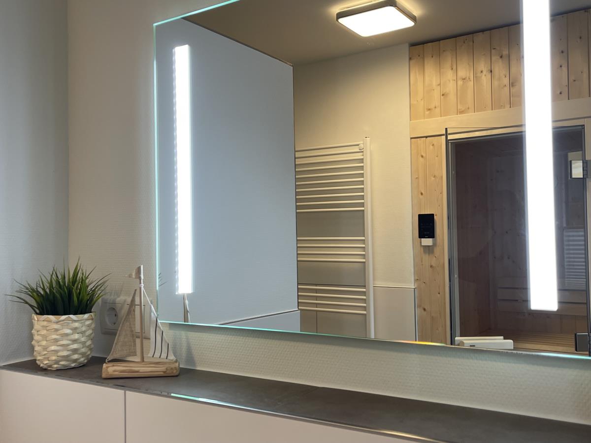 Das Badezimmer gleicht einer Wohlfühloase mit großzügiger Dusche. Highlight: Die wohnungseigene finnische Sauna. Sei mutig! Schnapp dir deinen Bademantel, spring in die Ostsee und danach schön schwitzen und entspannen. Denn das Beste: Die Ostsee mit Promenade ist nur 80 Meter entfernt.