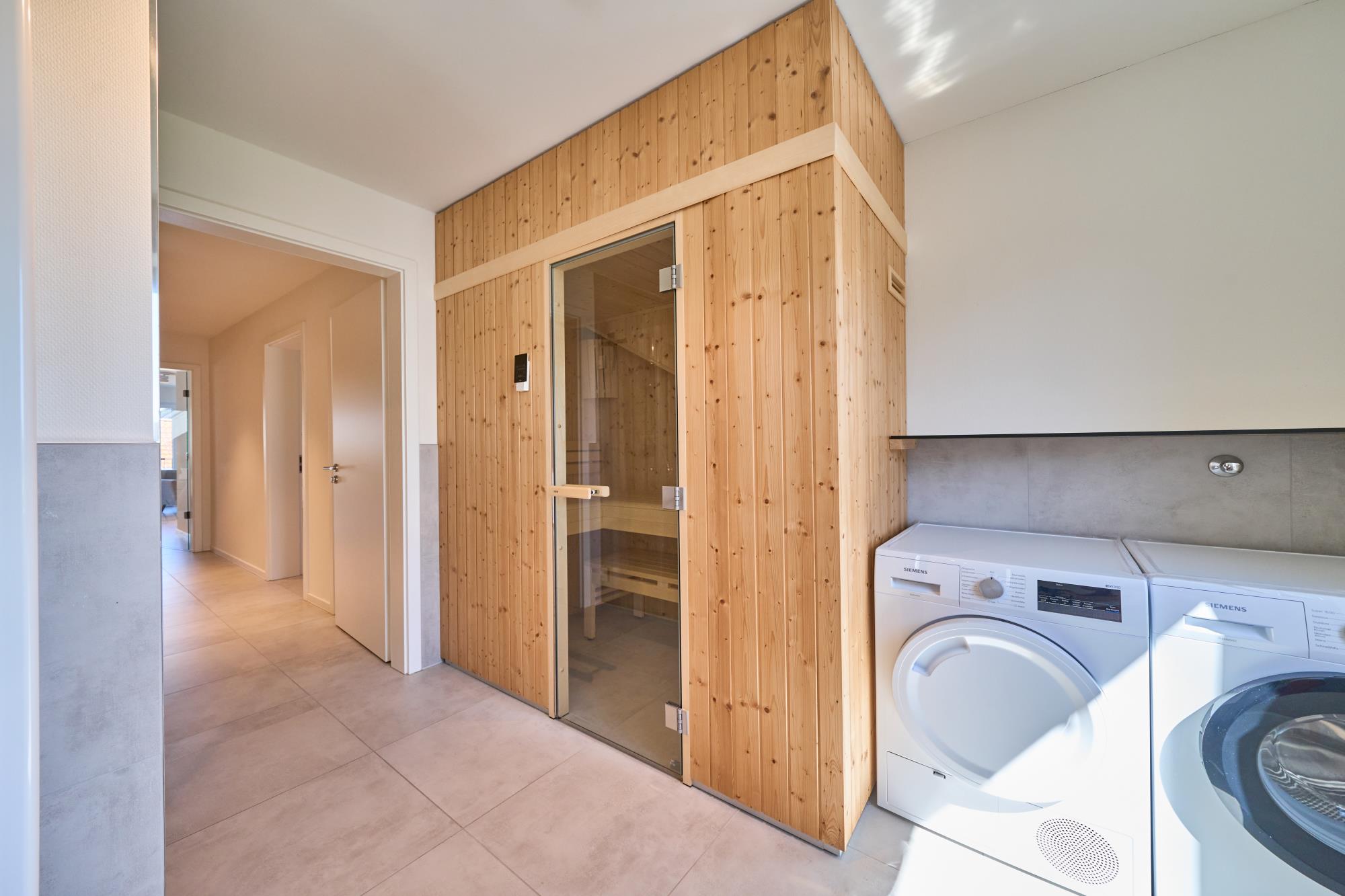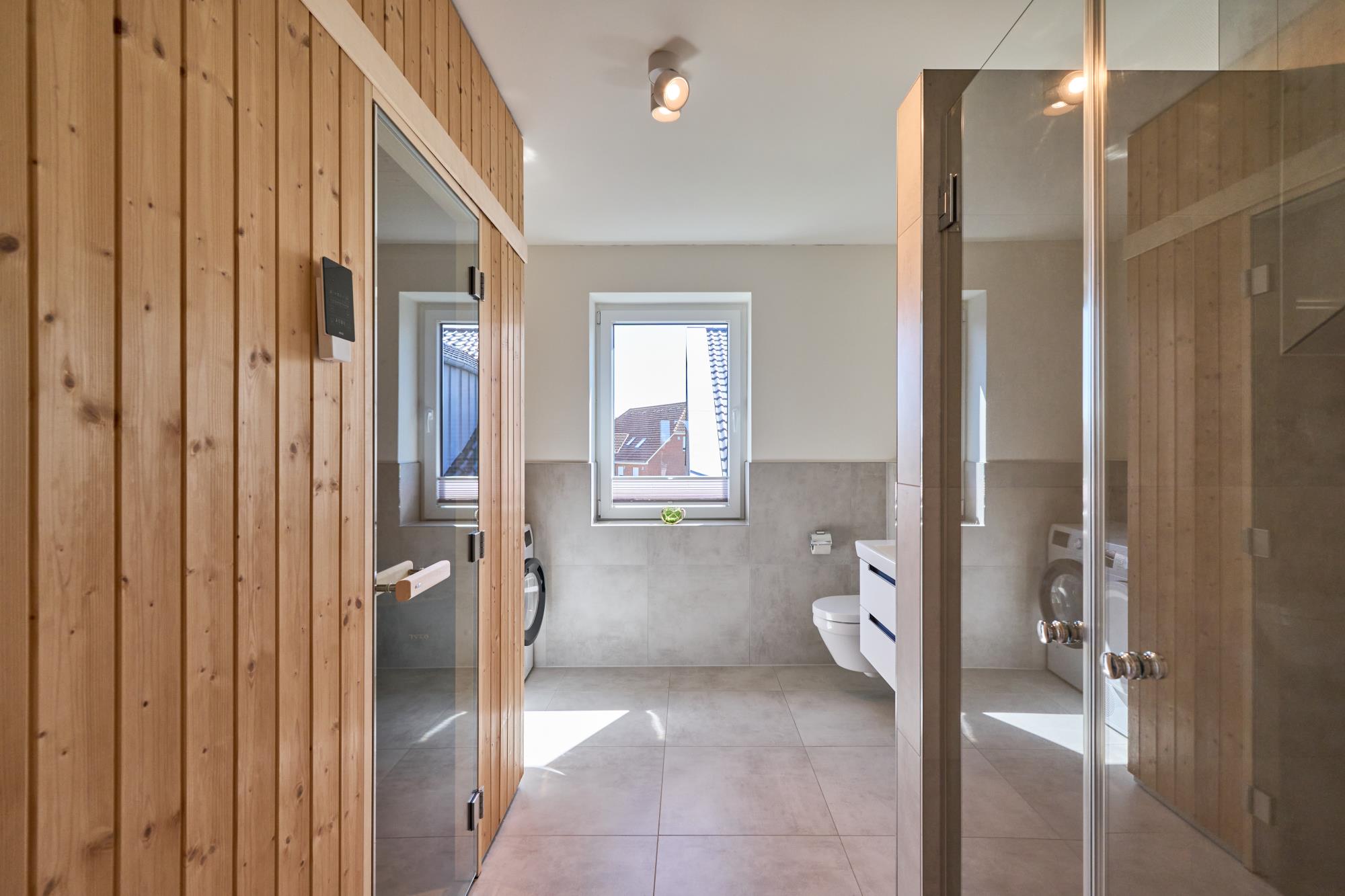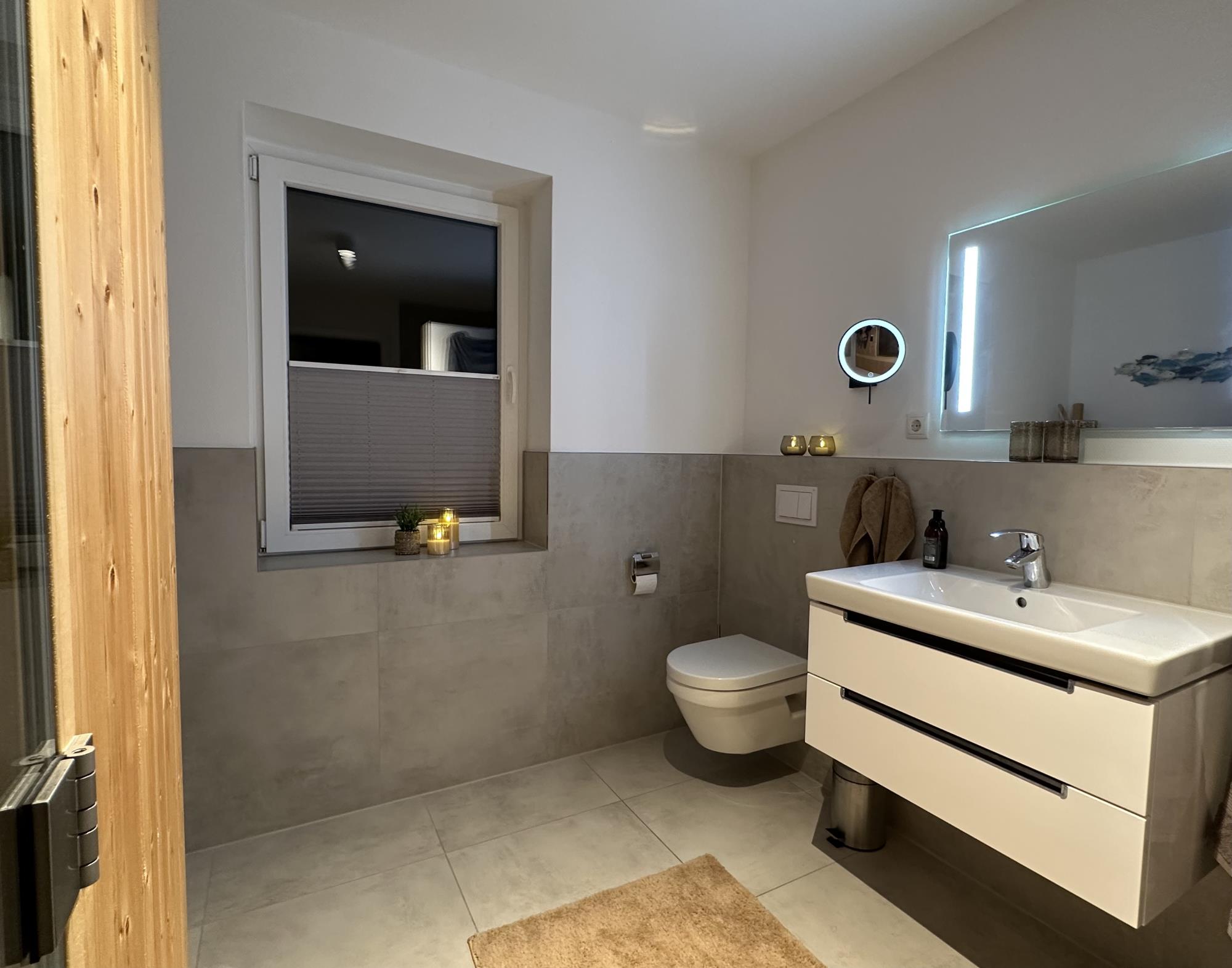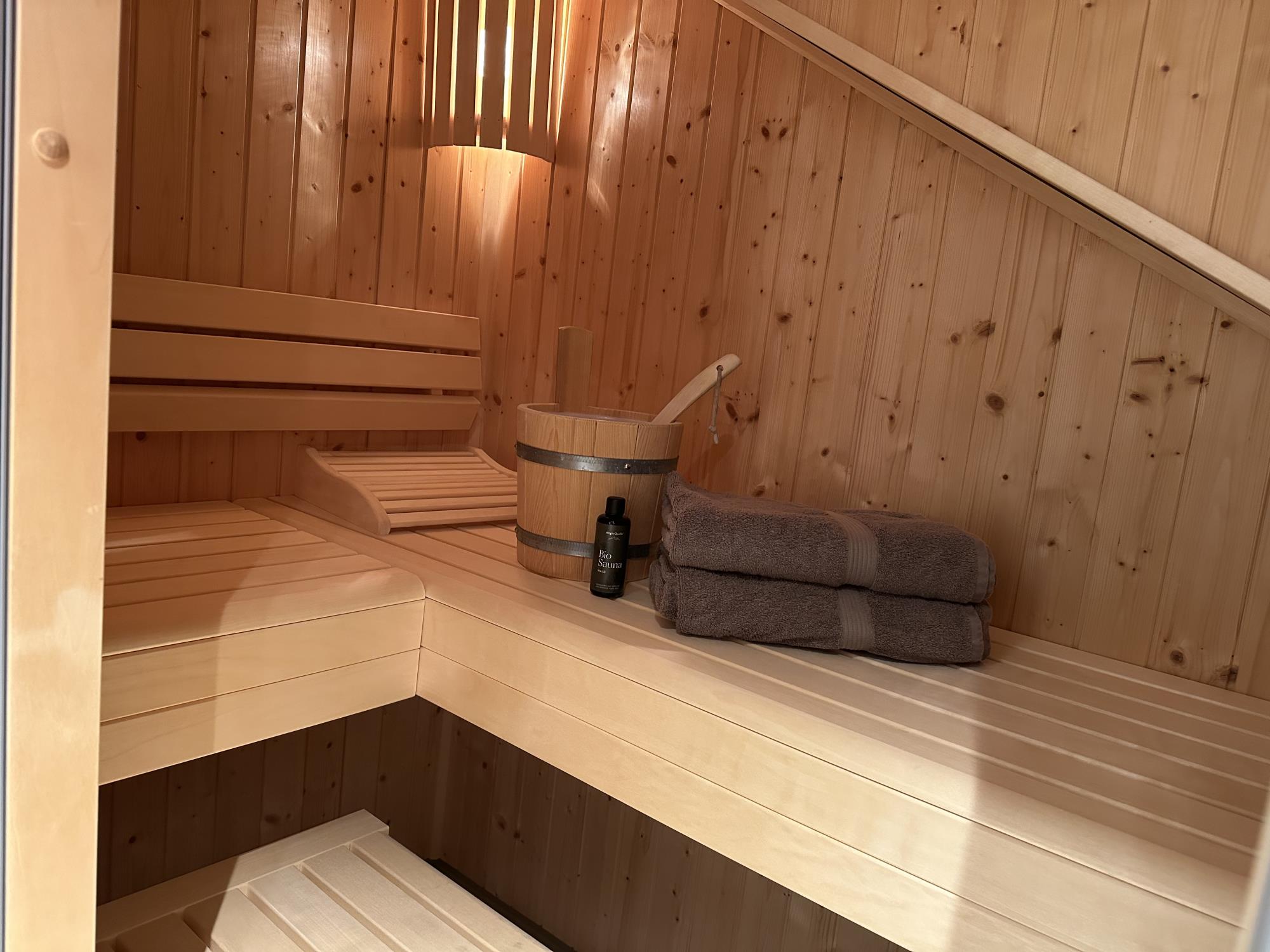 Das Wellnessbad bietet eine walk-in-Dusche sowie eine eigene finnische Sauna.
