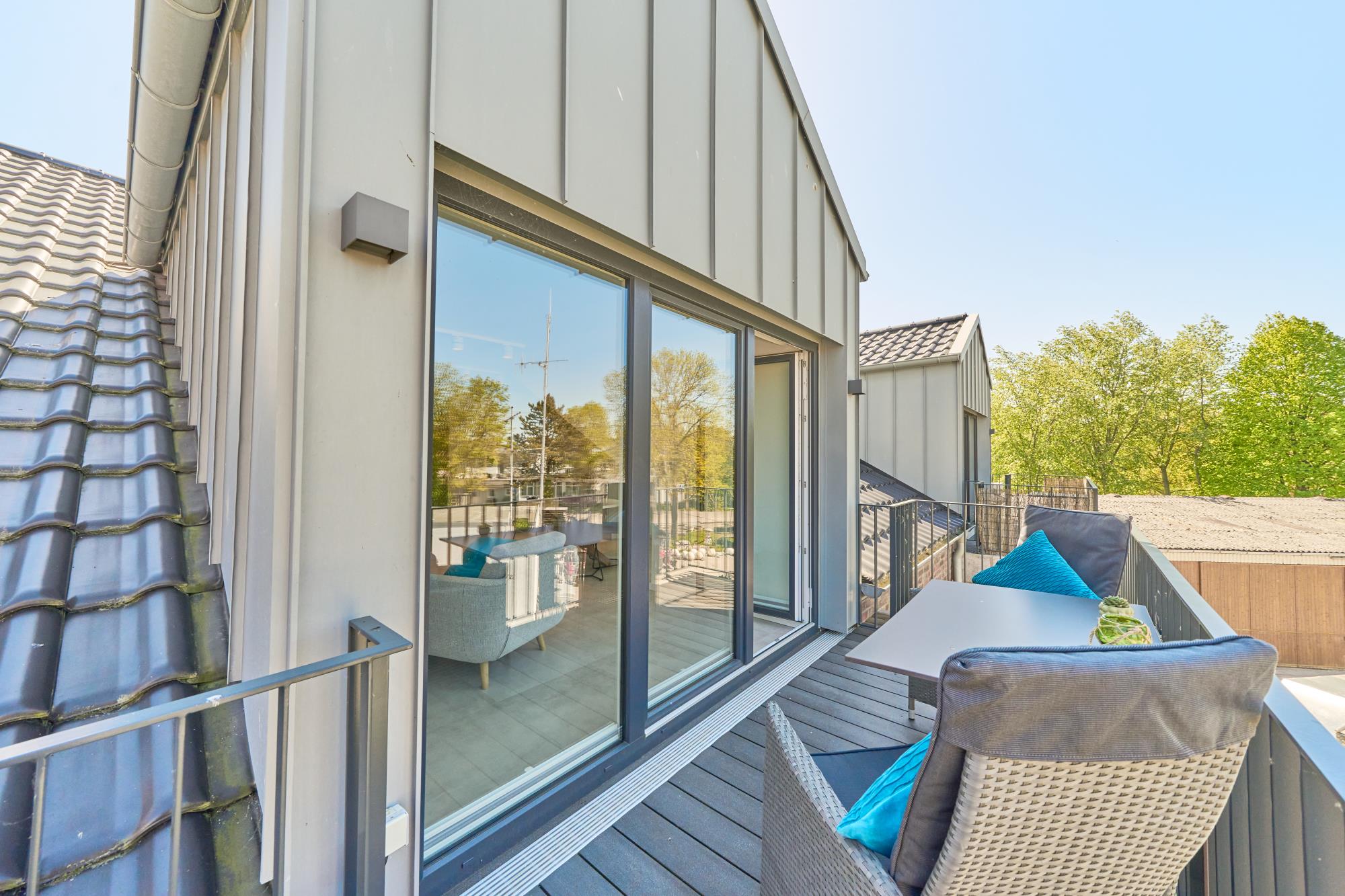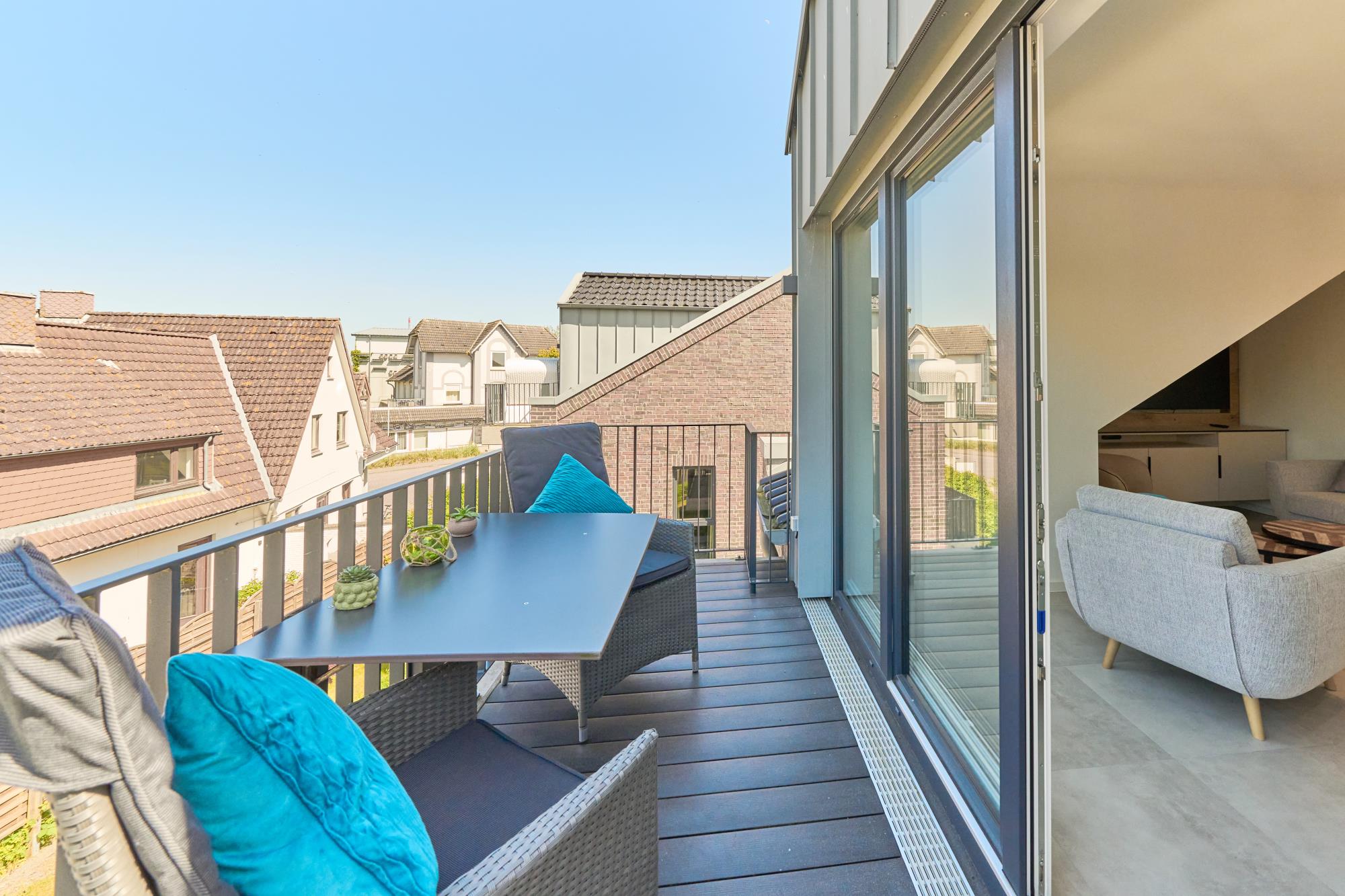 Vom Wohnbereich gelangen Sie auf den Balkon - der perfekte Ort für den ersten Kaffee am Morgen und die frische Meeresluft.