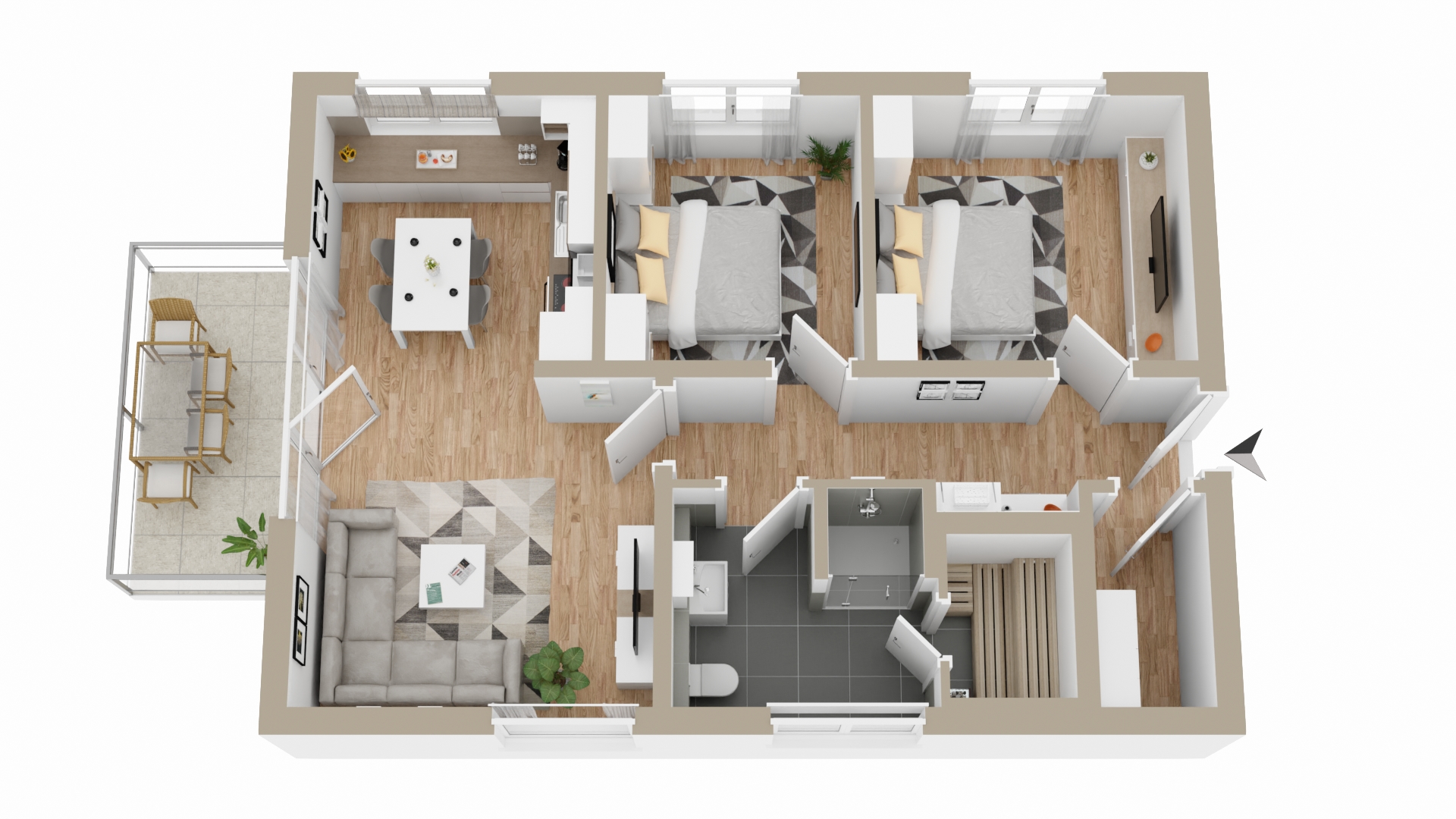 Zwei Schlafzimmer, ein großzügiges Bad mit eigener Sauna, ein offener Wohnbereich inkl. Küche und Balkonzugang bieten ein herrliches Wohngefühl für eine kurze Auszeit und ganz große Ferien an der Ostseeküste, mitten in der Lübecker Bucht.