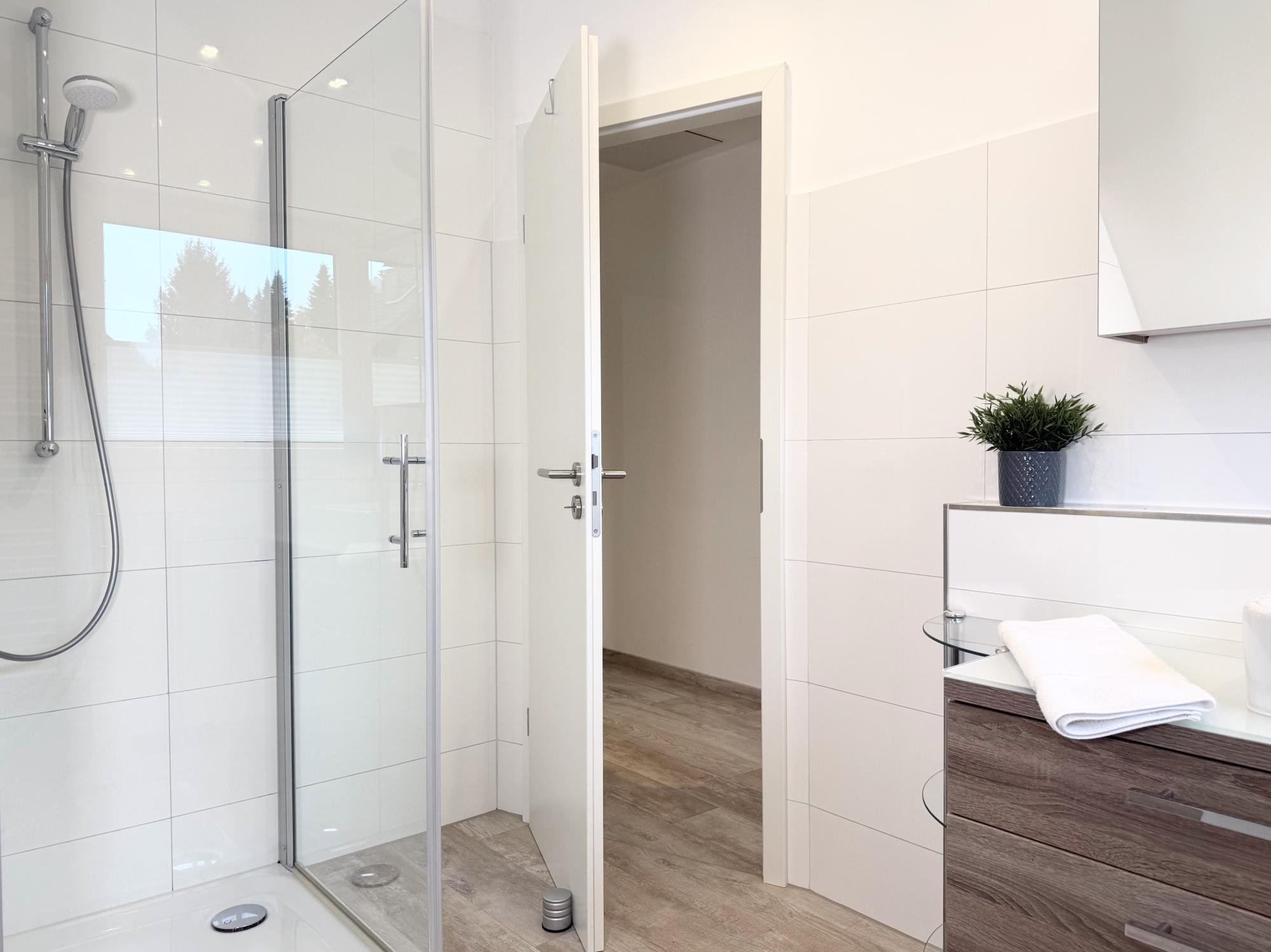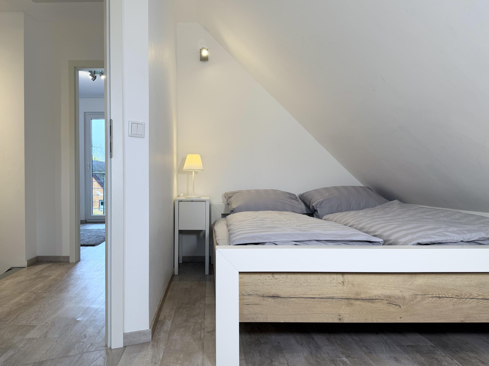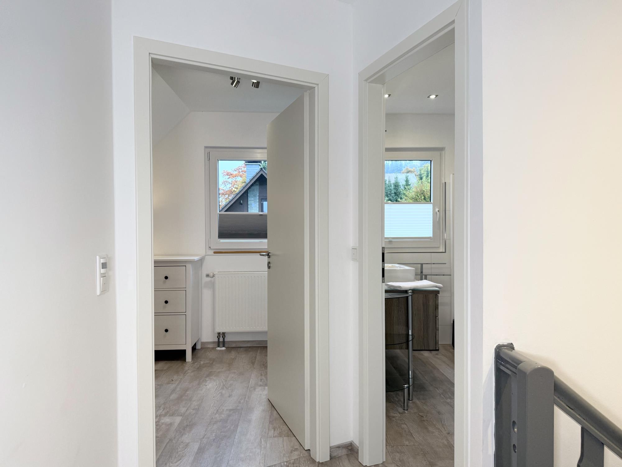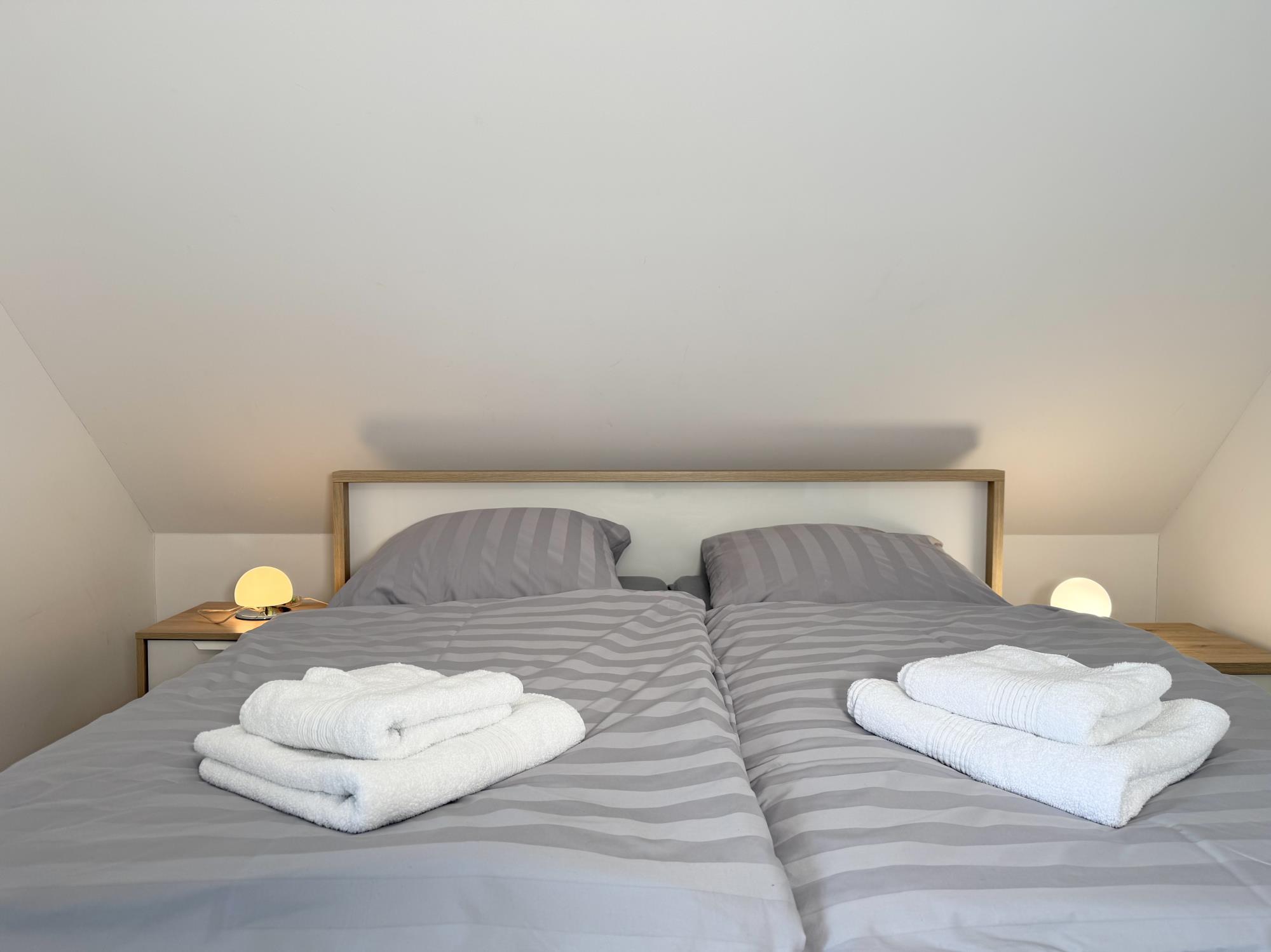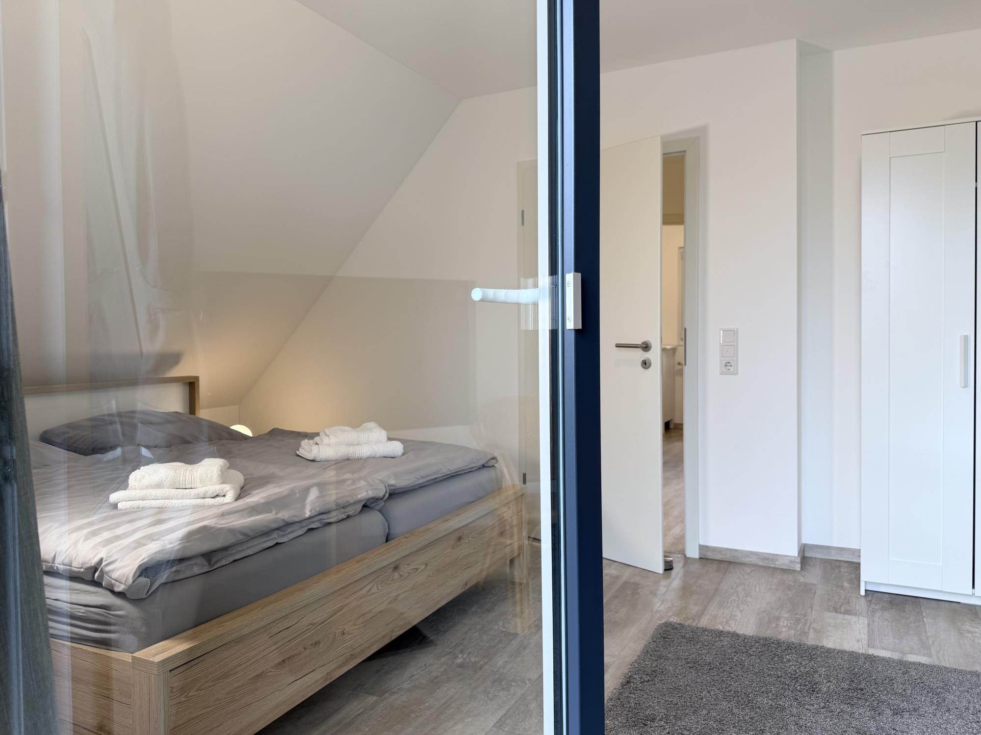 Zudem gibt es 2 Schlafzimmer mit jeweils einem Doppelbett (180cm x 200 cm & 160cm x 200 cm) und ein modernes Bad im Obergeschoss, sowie im Untergeschoss.