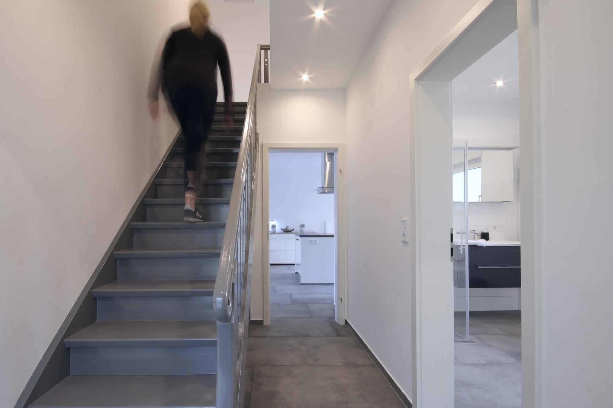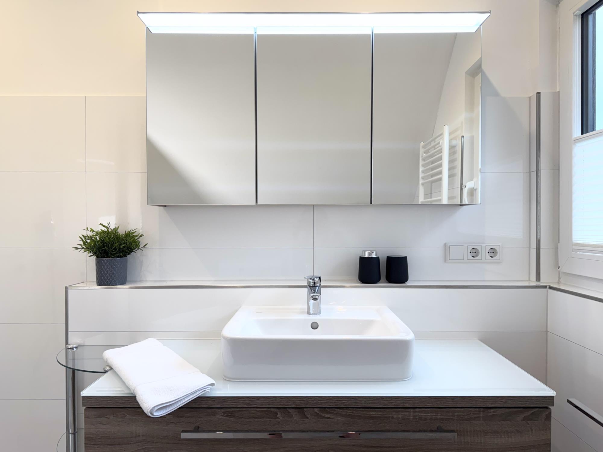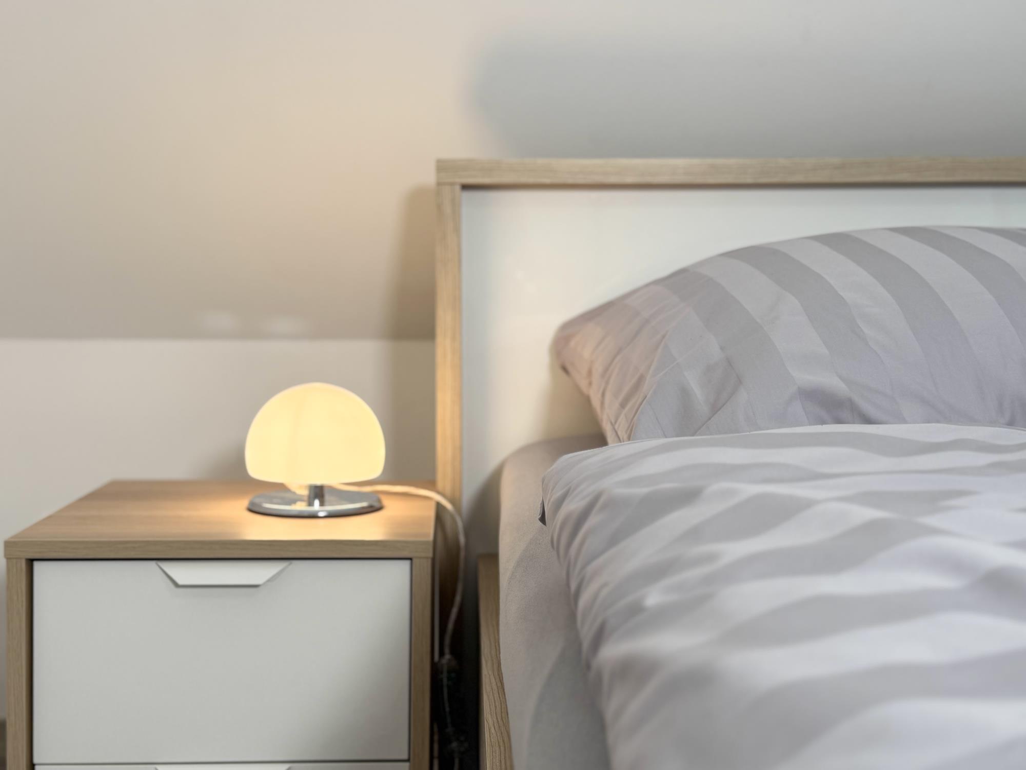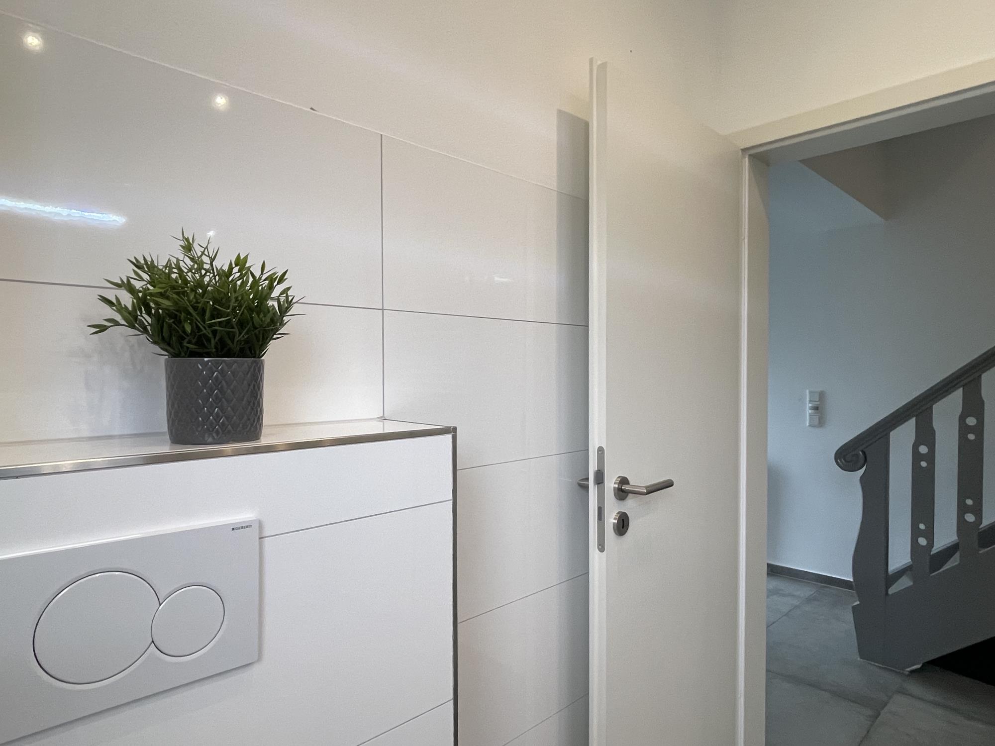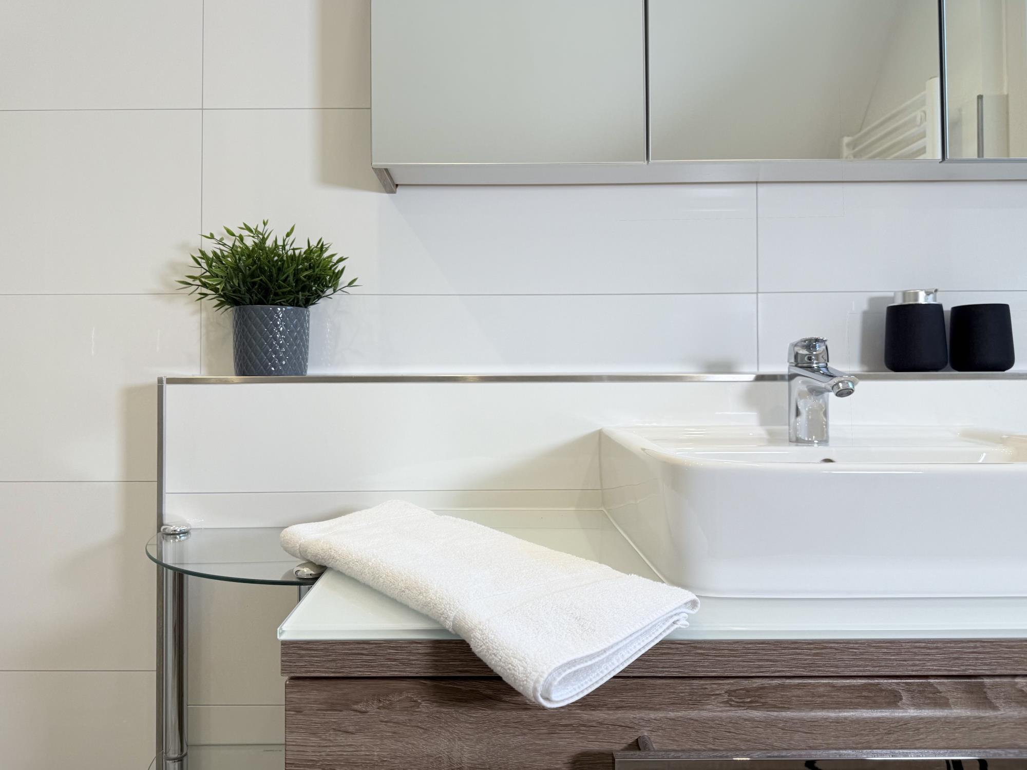 Zudem gibt es 2 Schlafzimmer mit jeweils einem Doppelbett (180cm x 200 cm & 160cm x 200 cm) und ein modernes Bad im Obergeschoss, sowie im Untergeschoss.