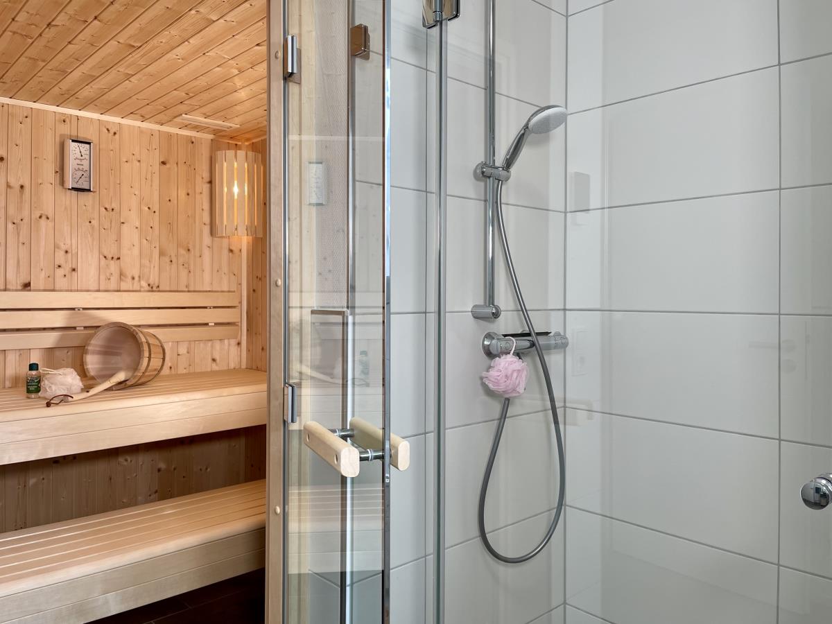Highlight auf dieser Ebene ist das große Bad, mit eigener Sauna, Badewanne und bodengleichem Duschbereich. Perfekt für private Wellness-Momente an der Nordseeküste.