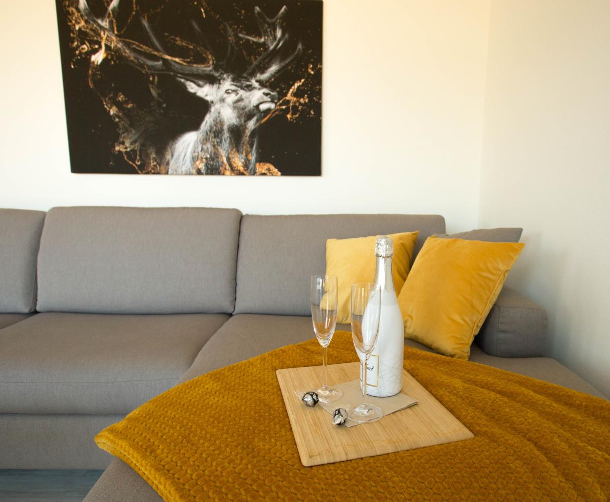 Im Wohn-/Essbereich findet Ihr Smart-TV mit allen Zugängen, die echte Film und Fußballfans unbedingt benötigen. WLAN gehört zum Standard.