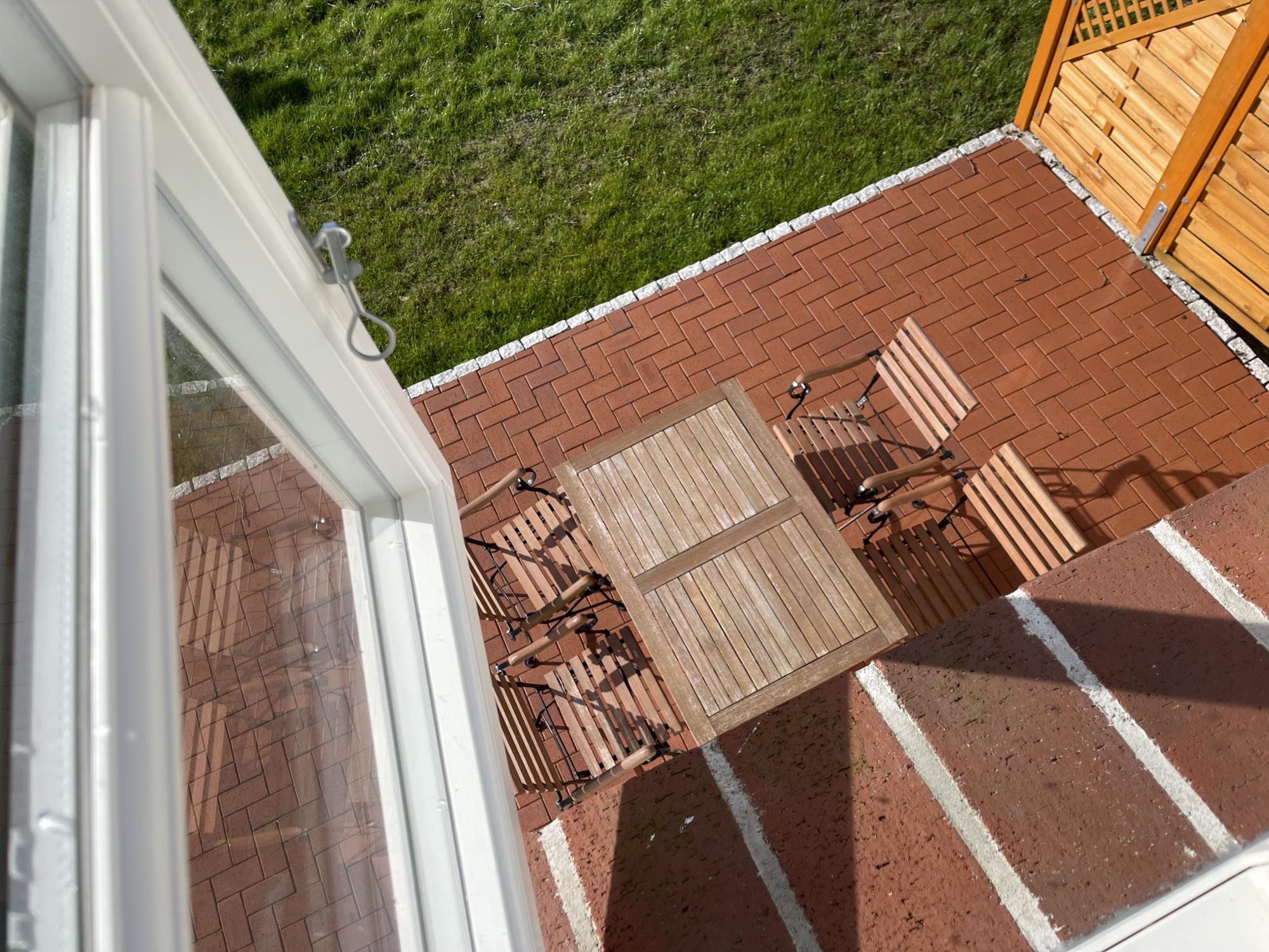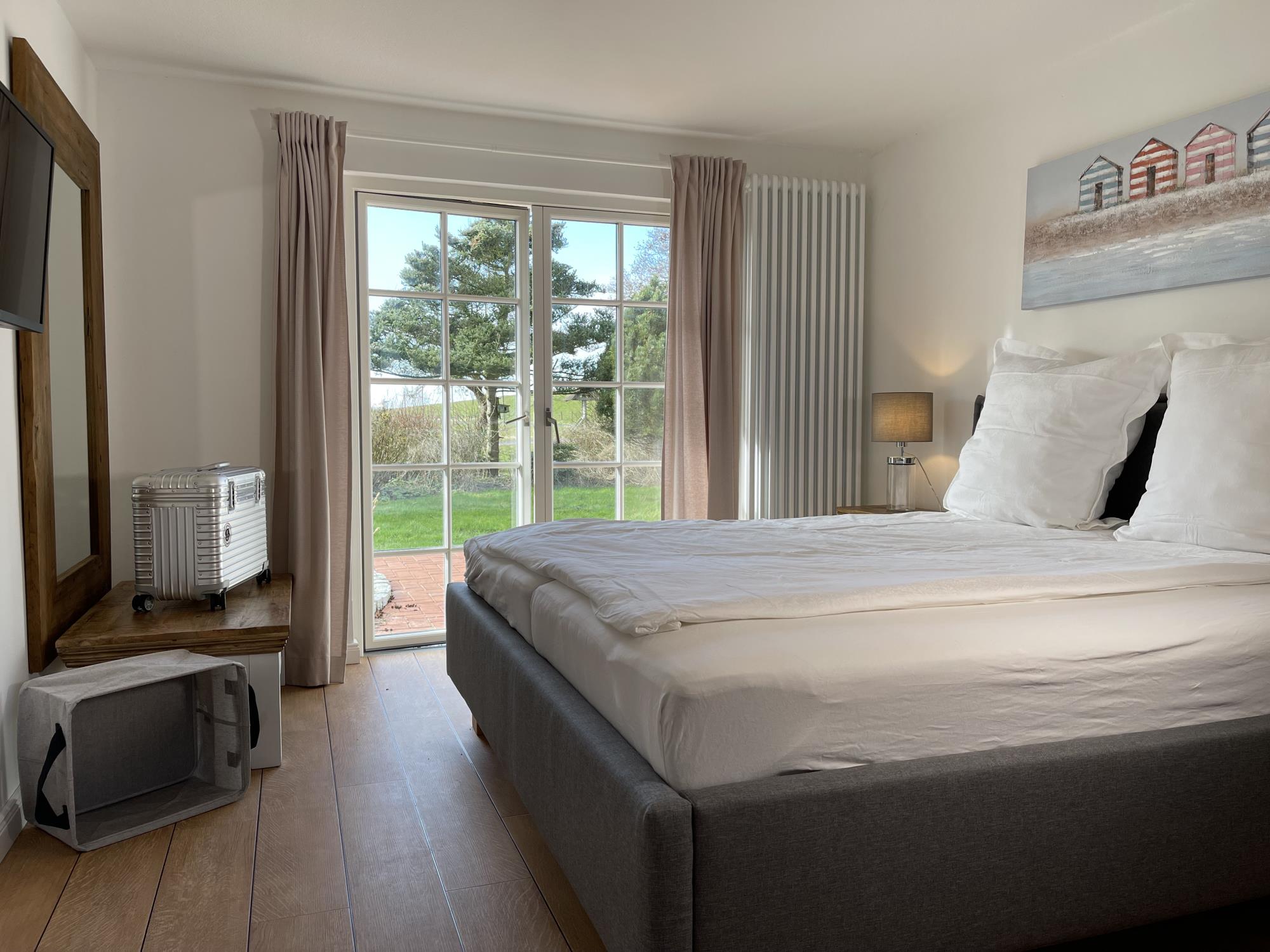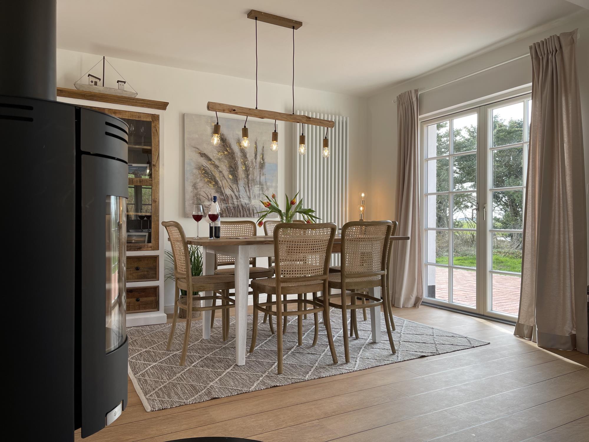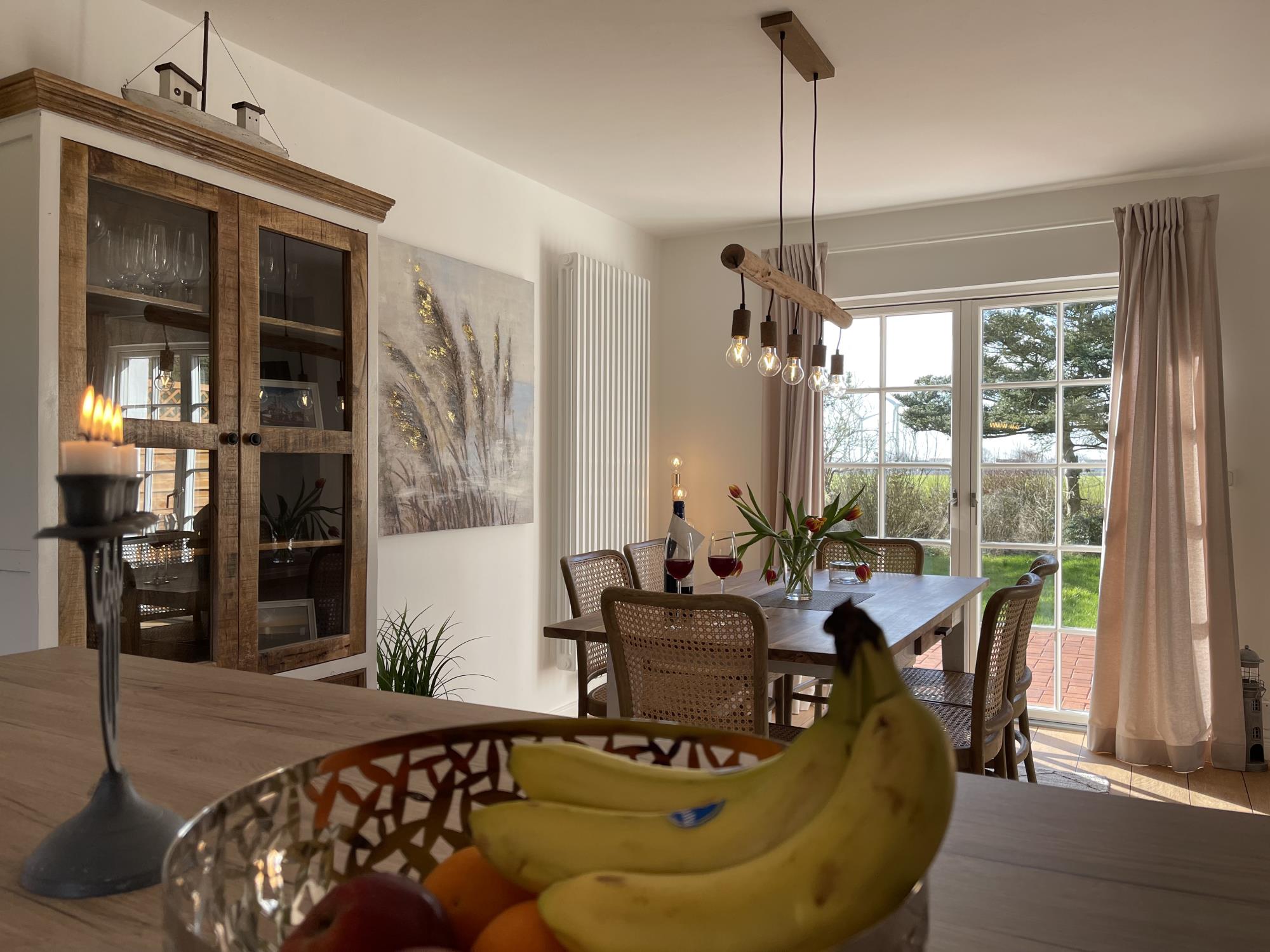 Die bodentiefen Fenster bieten Zugang zur geschützten Terrasse und sorgen für echten Durchblick auf´s platte Land, die angrenzenden Felder und Wiesen, ein bisschen Deich und sonst nix. - Nix, als Weite… Und jetzt mal gaaanz langsam und laut zuhause vorlesen: „Einfach nur Weite, Ruhe pur und ganz viel frische Nordseeluft.“ - Und? Hat´s funktioniert?