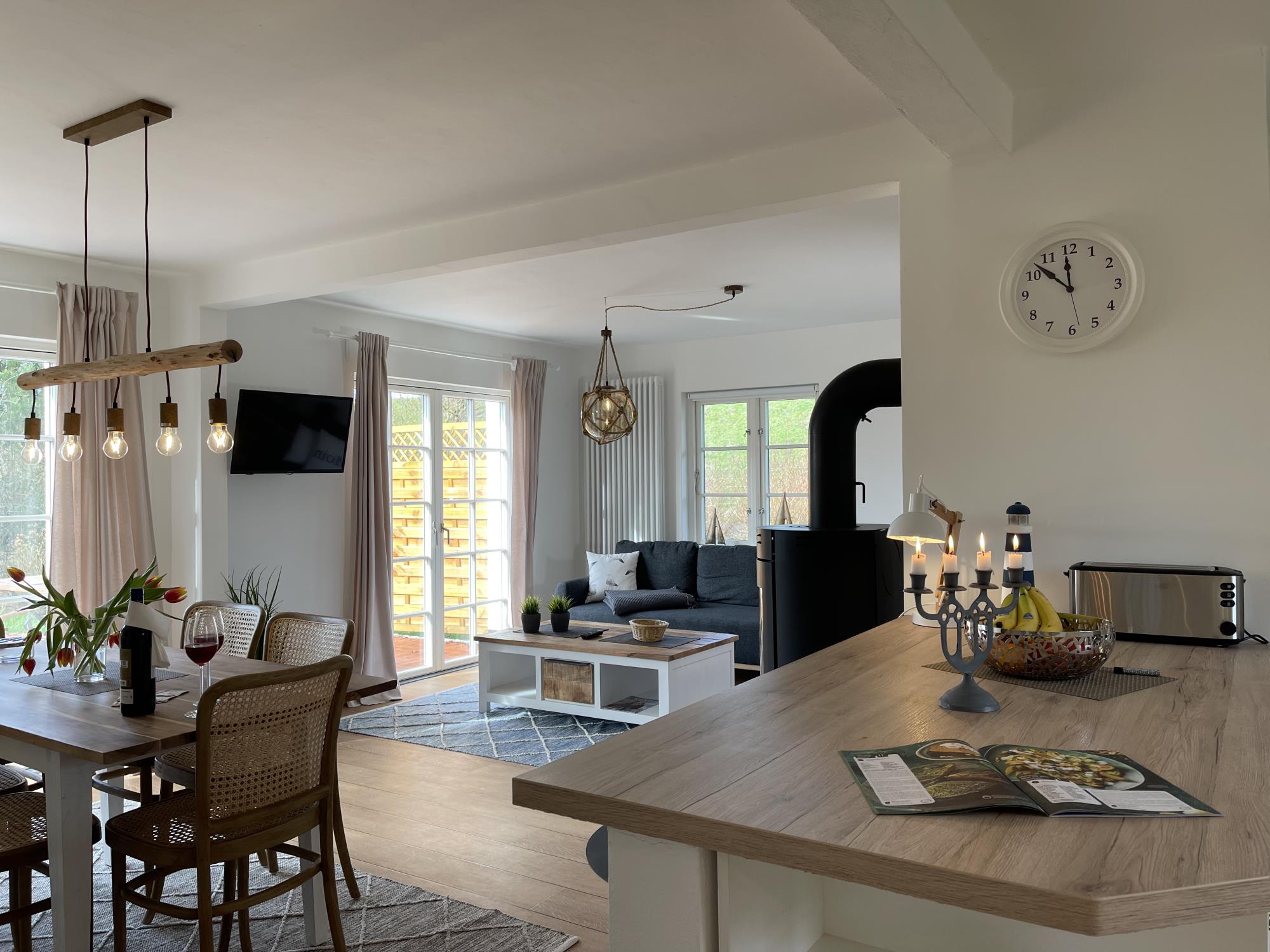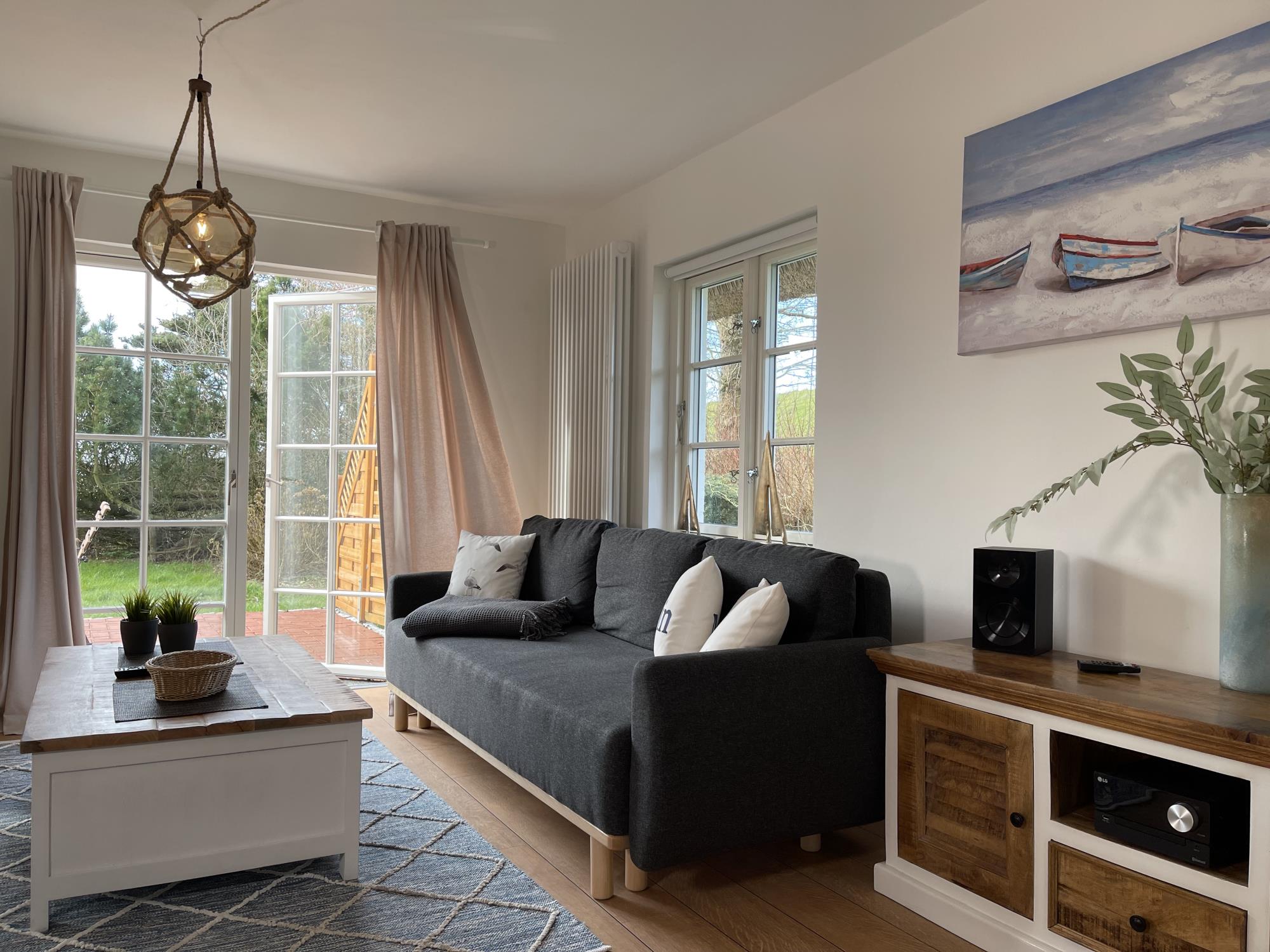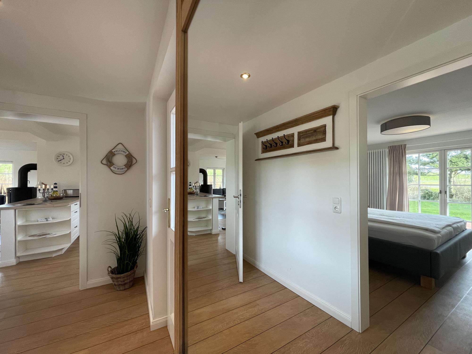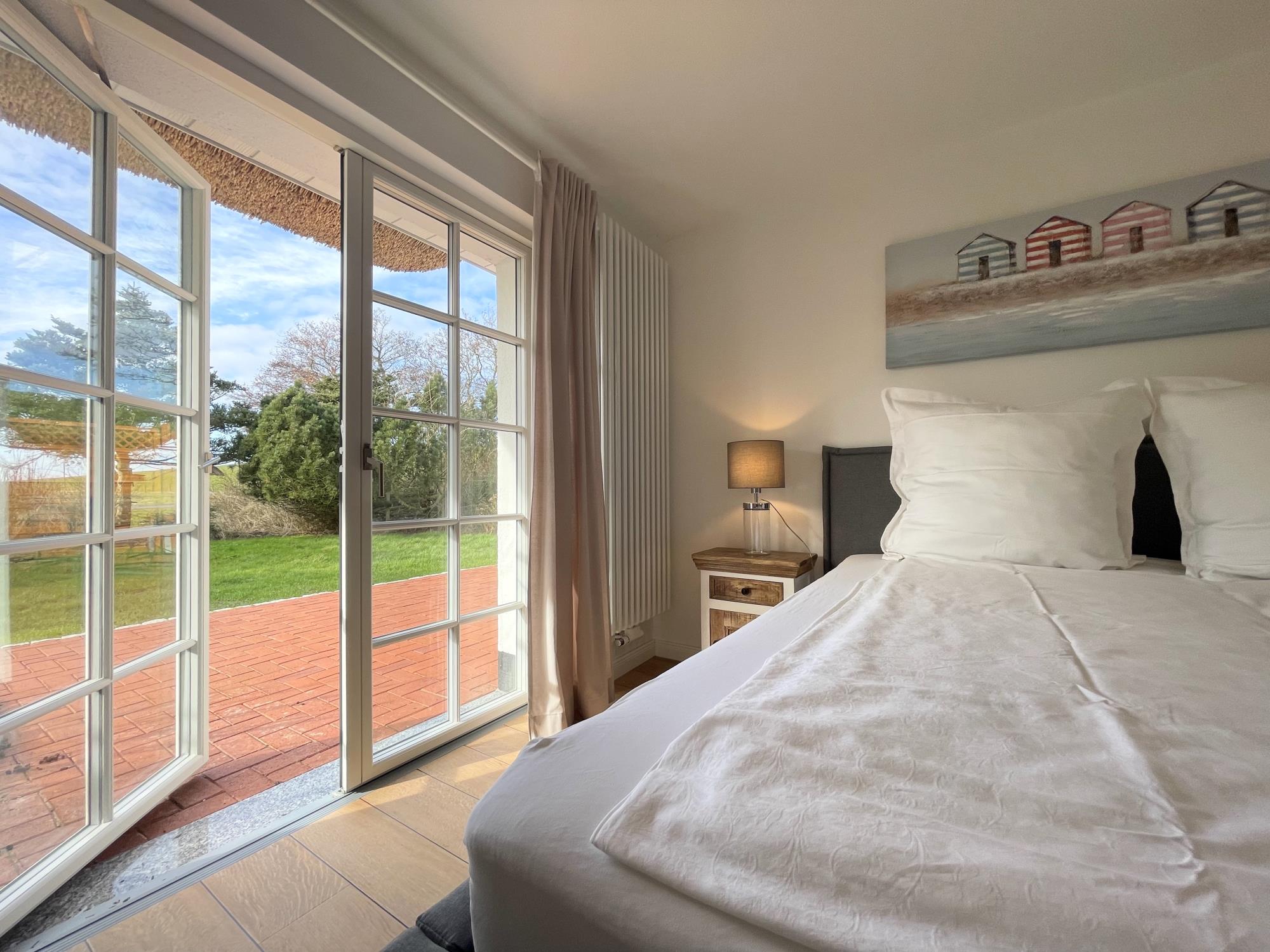Die bodentiefen Fenster bieten Zugang zur geschützten Terrasse und sorgen für echten Durchblick auf´s platte Land, die angrenzenden Felder und Wiesen, ein bisschen Deich und sonst nix. - Nix, als Weite… Und jetzt mal gaaanz langsam und laut zuhause vorlesen: „Einfach nur Weite, Ruhe pur und ganz viel frische Nordseeluft.“ - Und? Hat´s funktioniert?