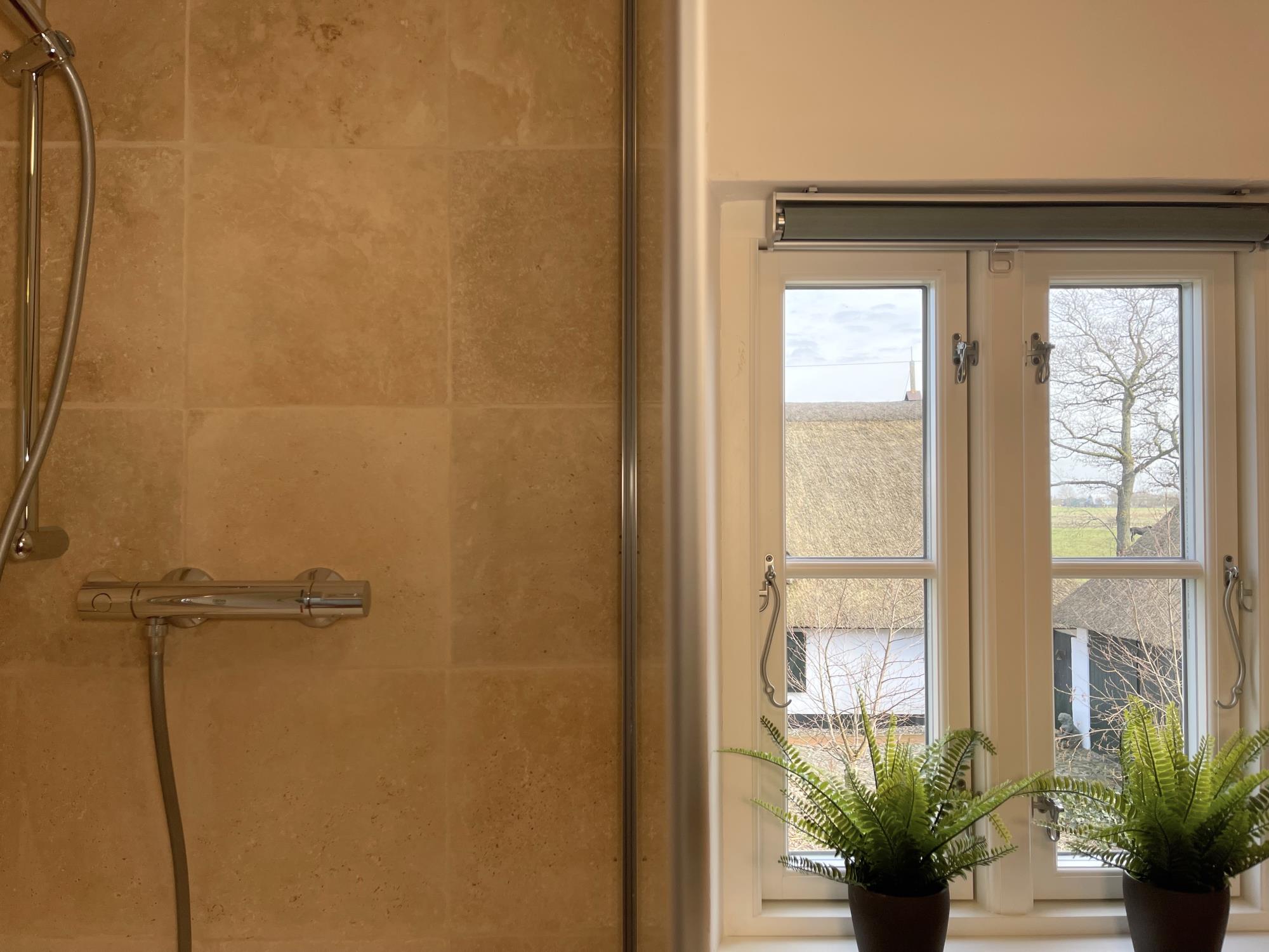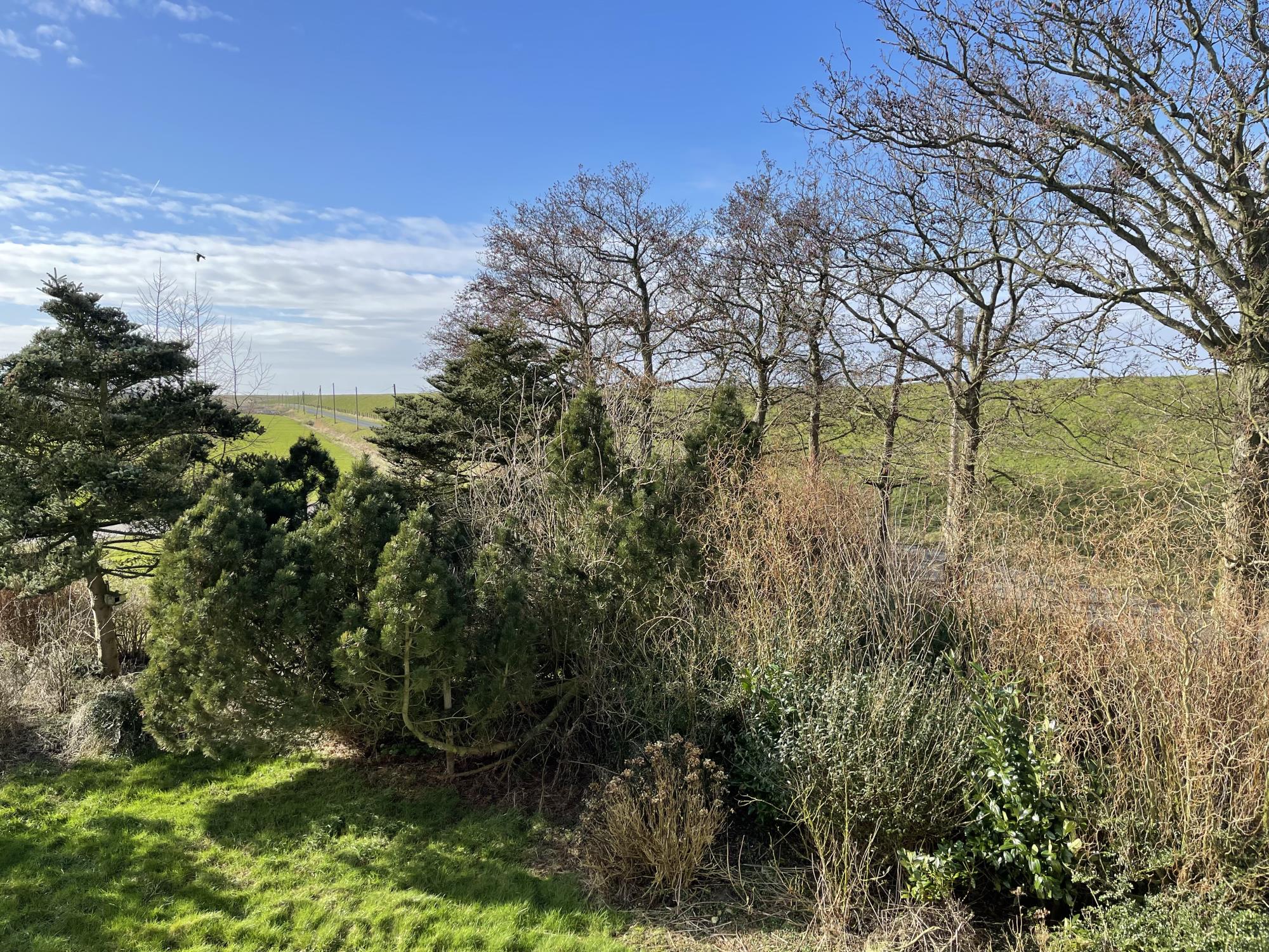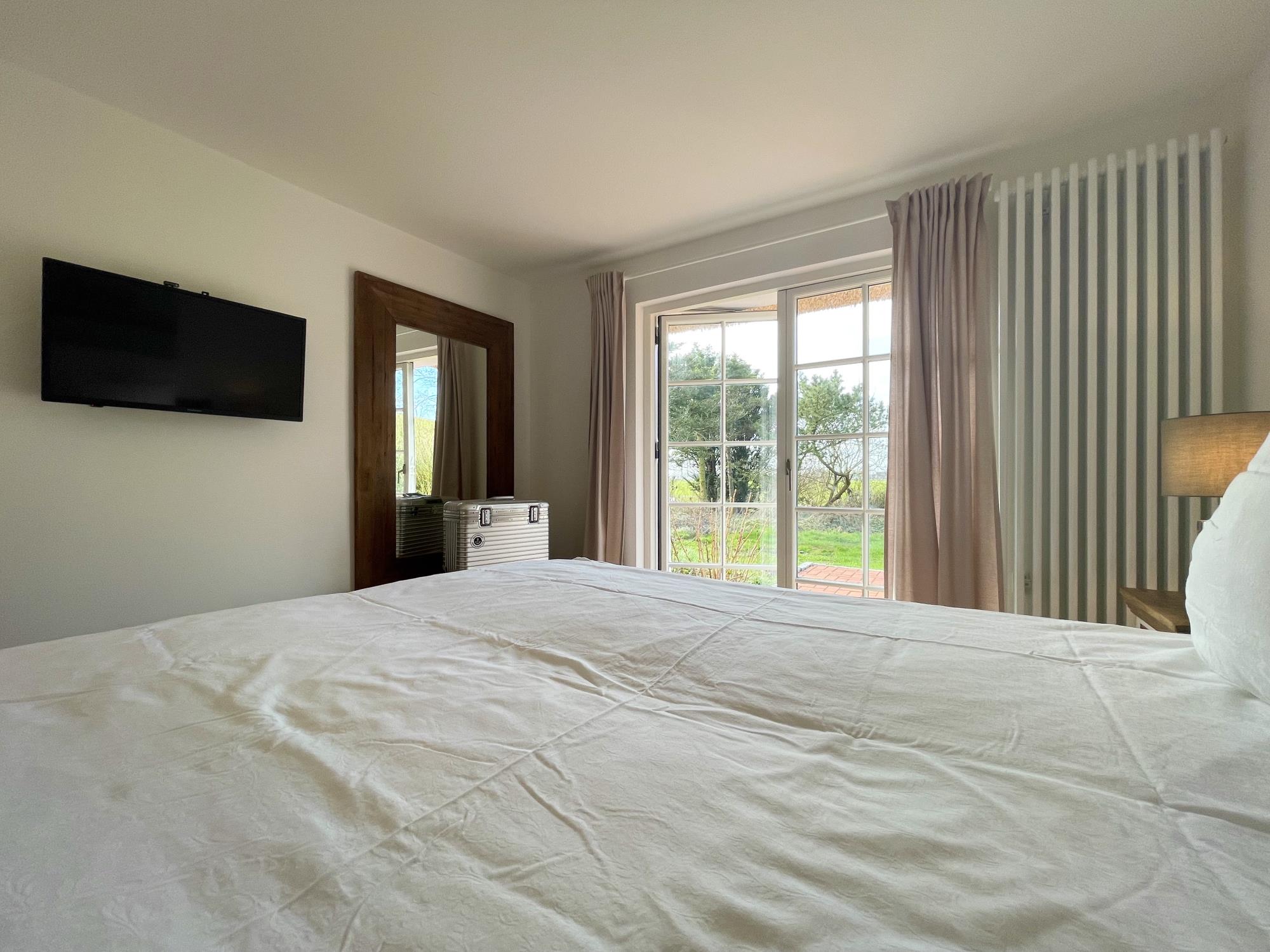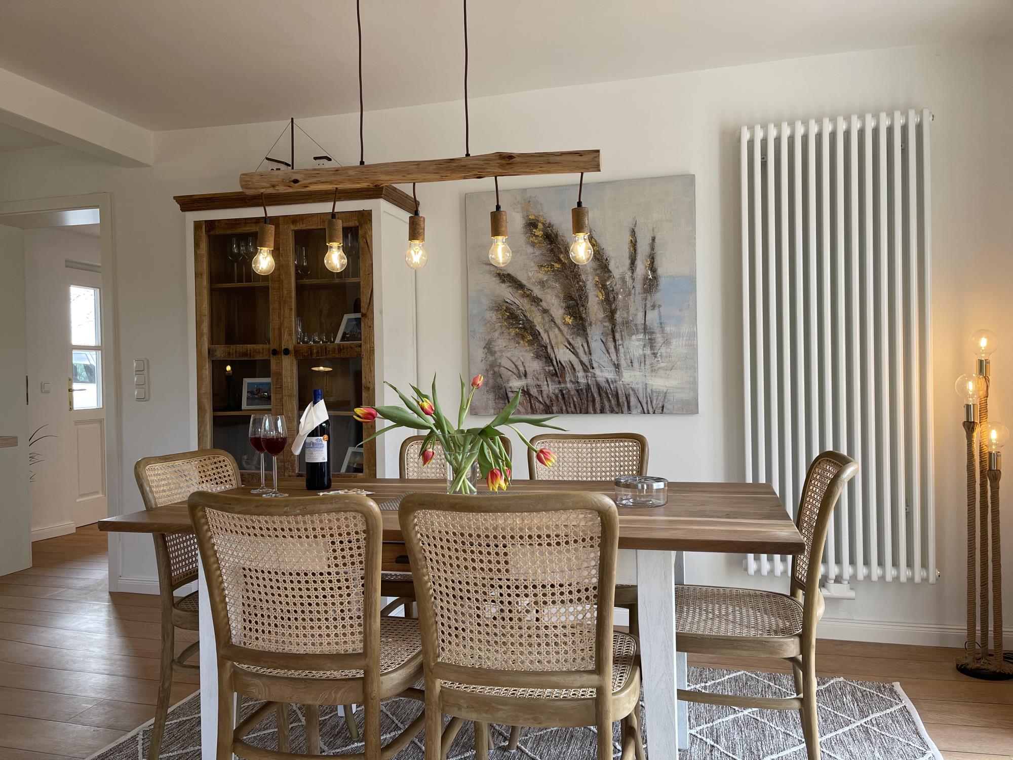 Die bodentiefen Fenster bieten Zugang zur geschützten Terrasse und sorgen für echten Durchblick auf´s platte Land, die angrenzenden Felder und Wiesen, ein bisschen Deich und sonst nix. - Nix, als Weite… Und jetzt mal gaaanz langsam und laut zuhause vorlesen: „Einfach nur Weite, Ruhe pur und ganz viel frische Nordseeluft.“ - Und? Hat´s funktioniert?