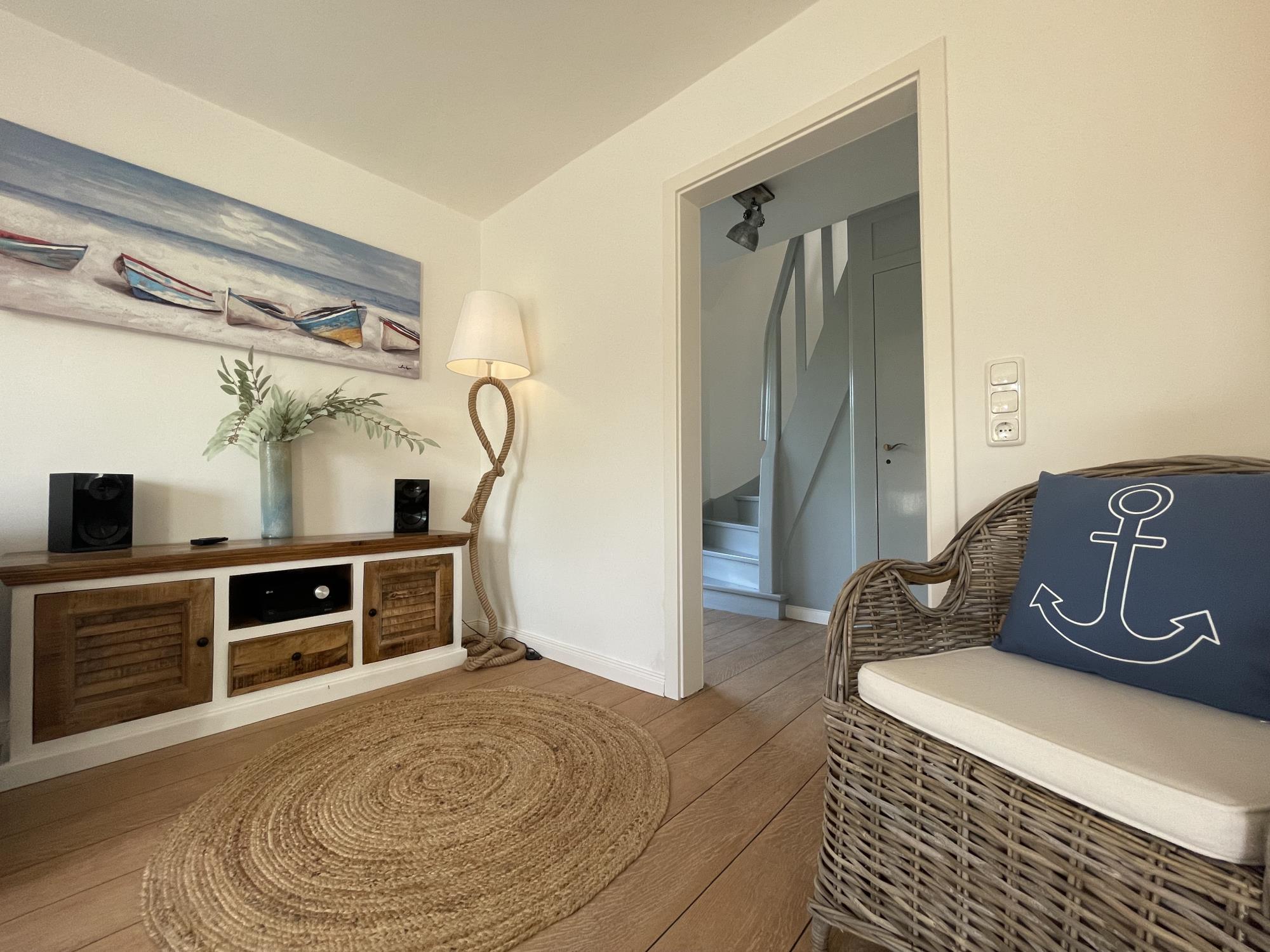 An die großzügige Eingangsdiele schließen Küche, Essbereich, die gemütliche Sofaecke und ein großes Bad mit Wanne und Dusche an. Ein Schlafzimmer mit Terrassenzugang gibt´s ebenfalls auf dieser Ebene. Smart-TV und WLAN gehören zum Standard, braucht hier aber eigentlich niemand.