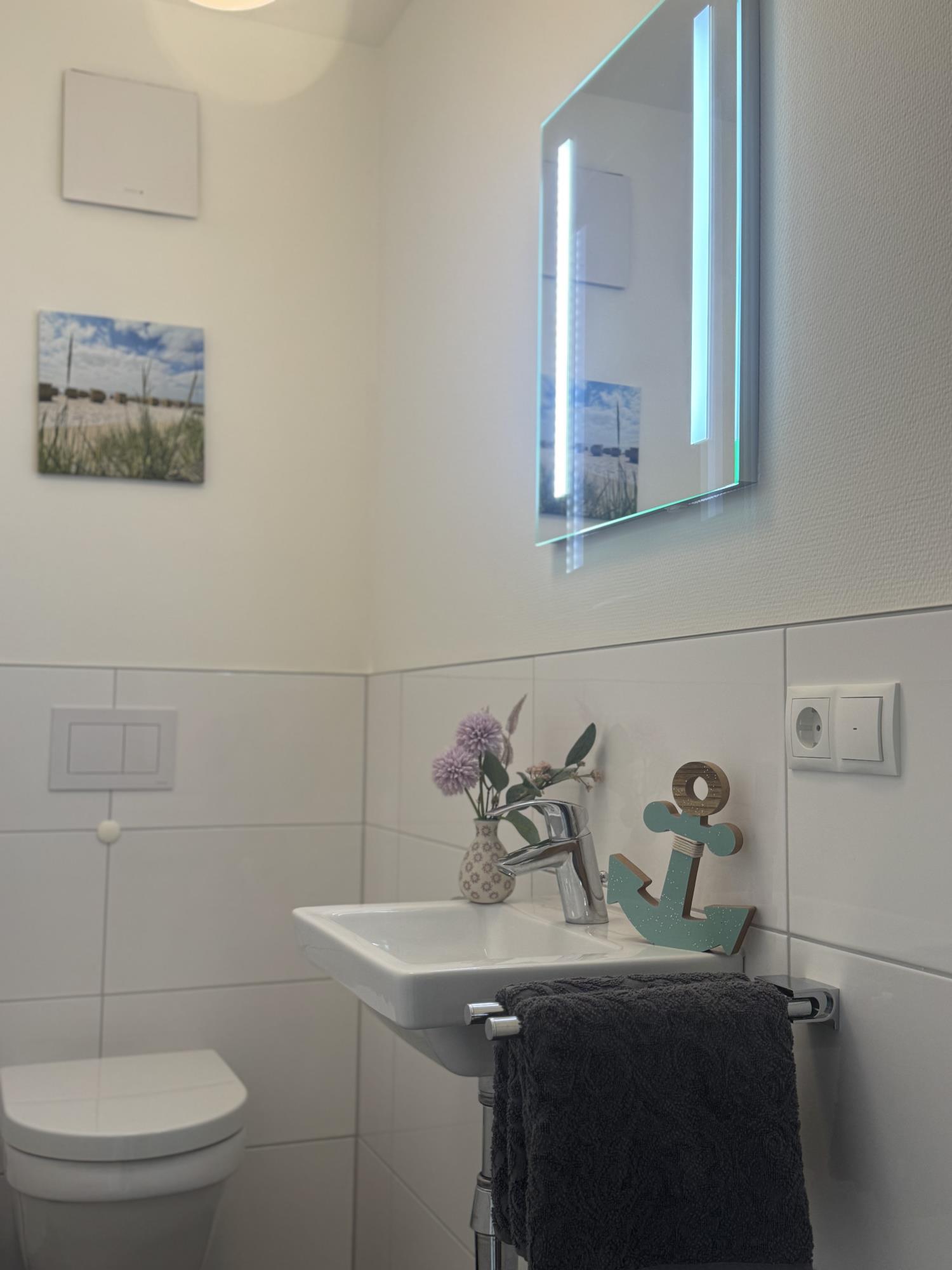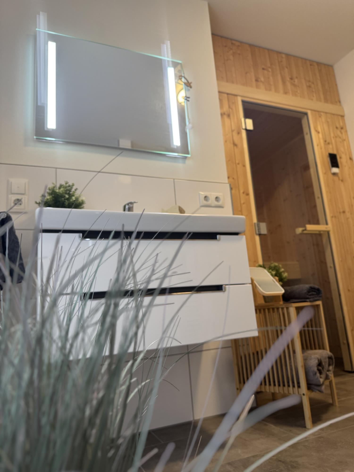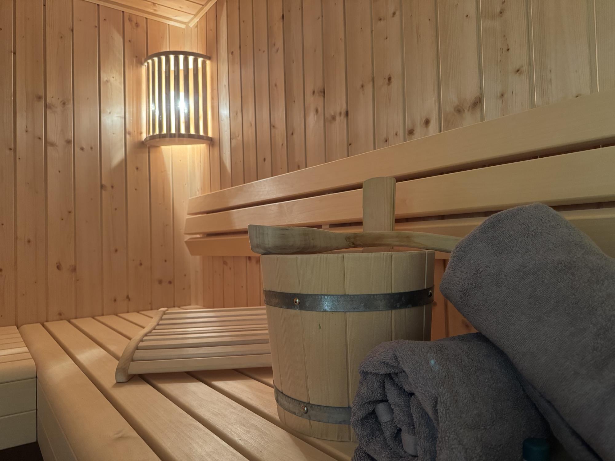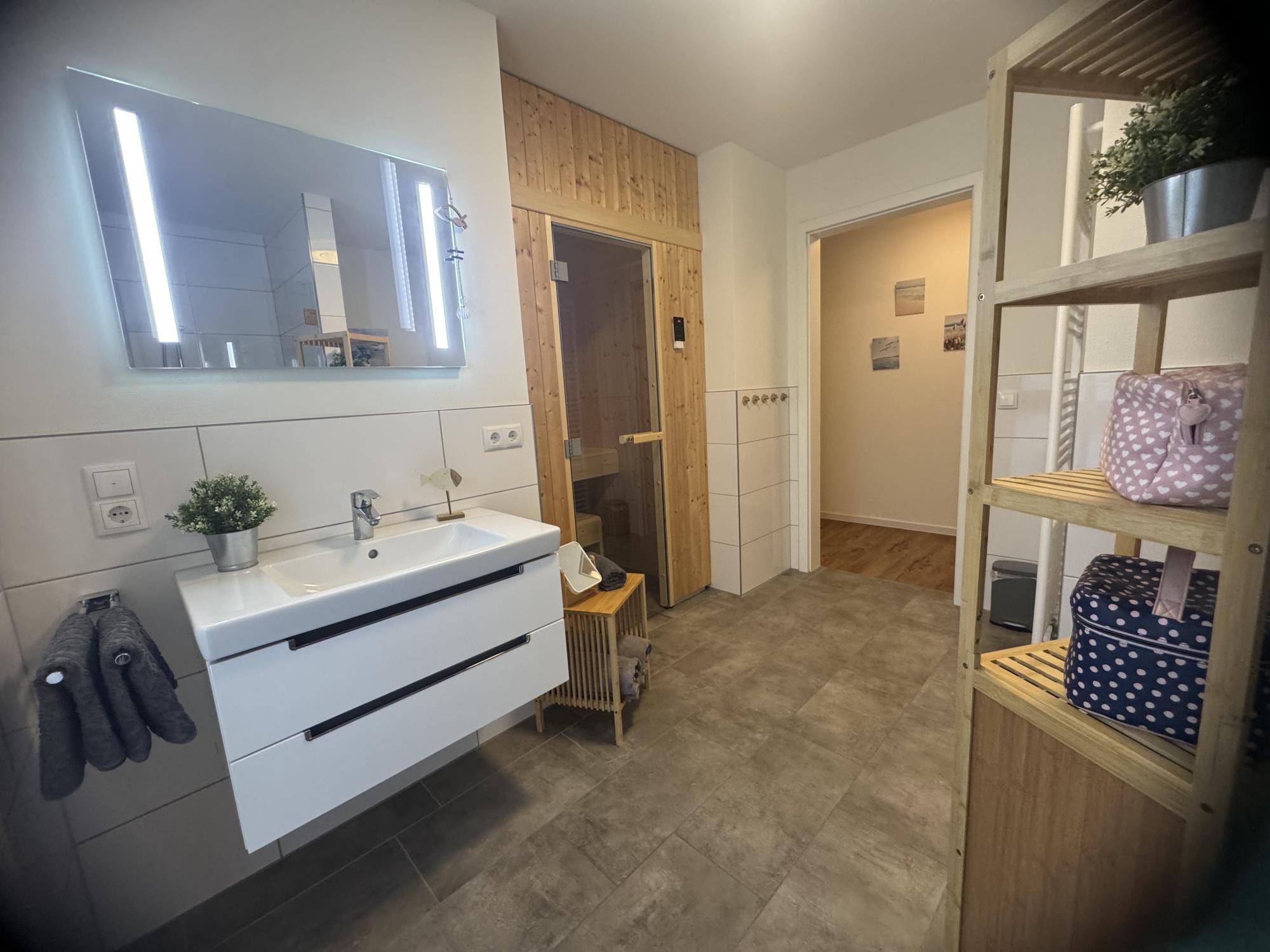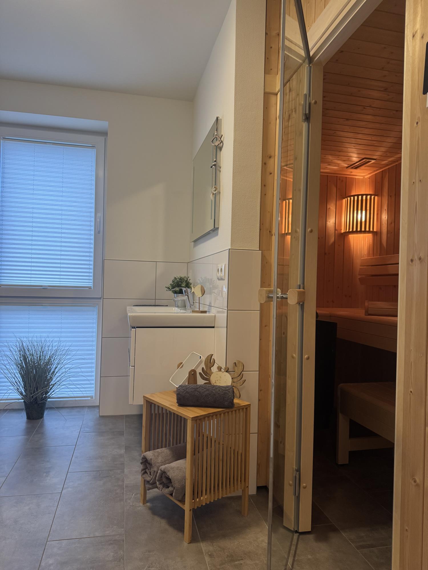 Dazu gibt es ein geräumiges Bad mit eigener Sauna und ein separates Gäste-WC.