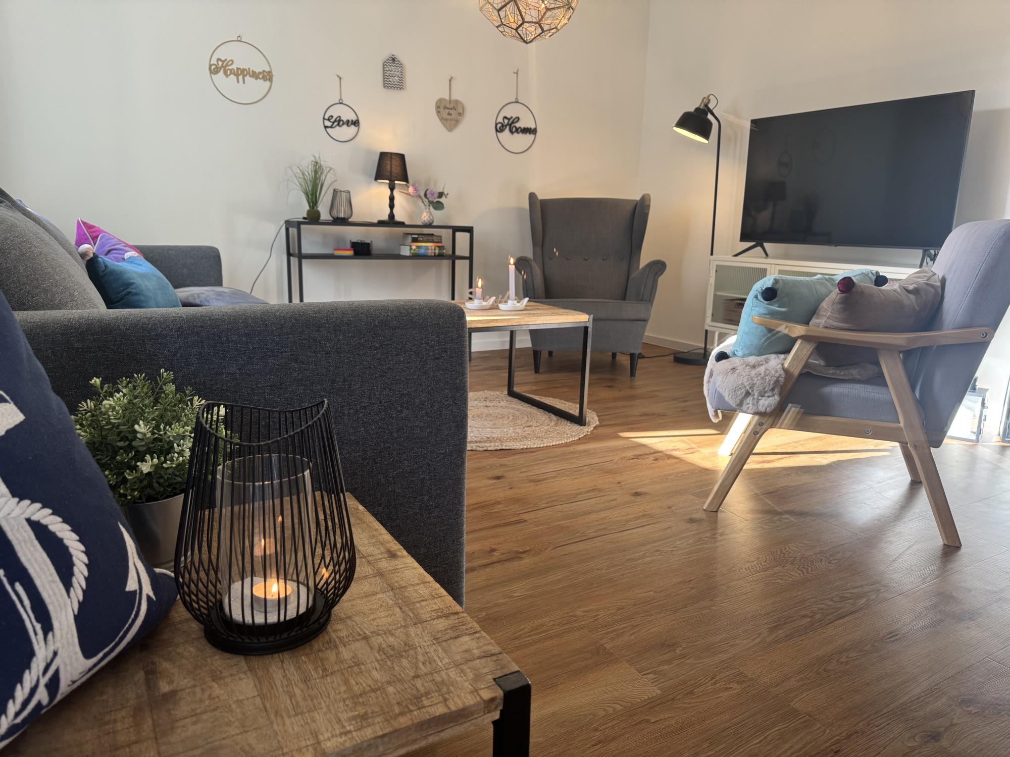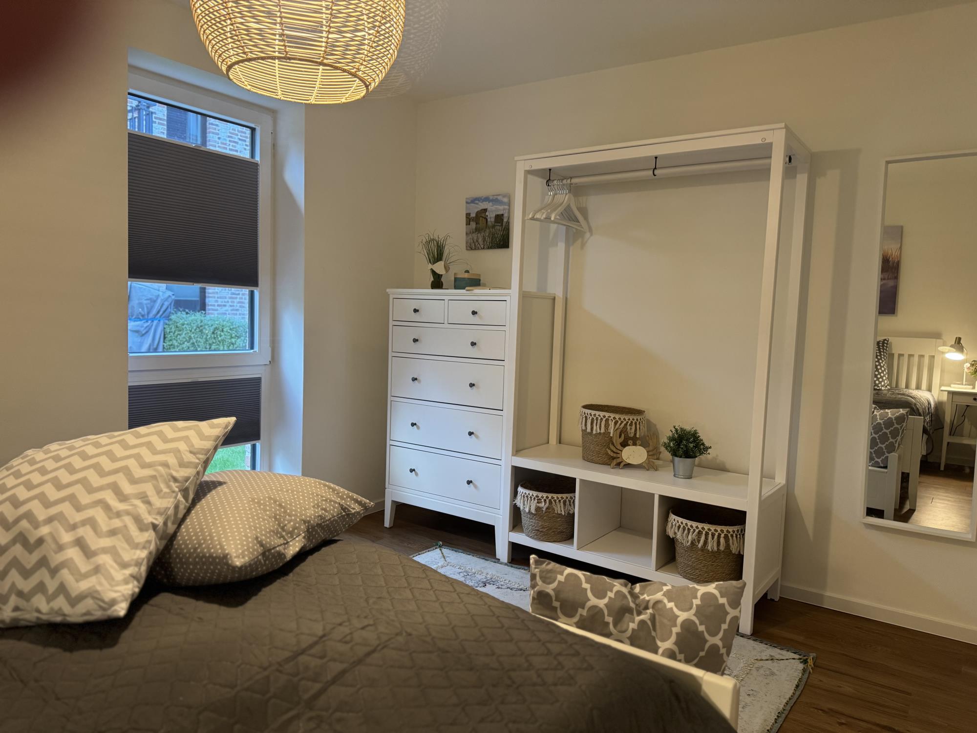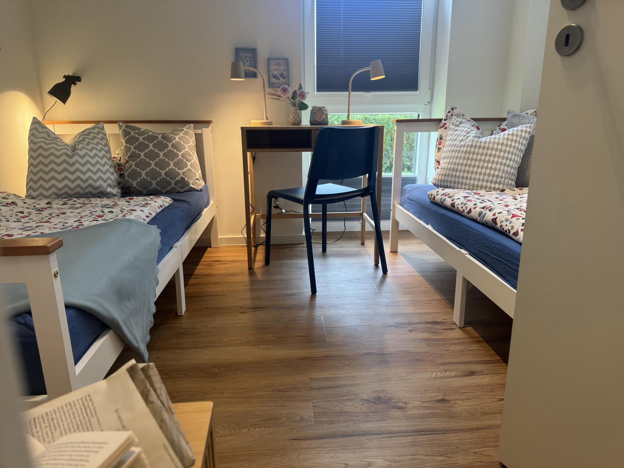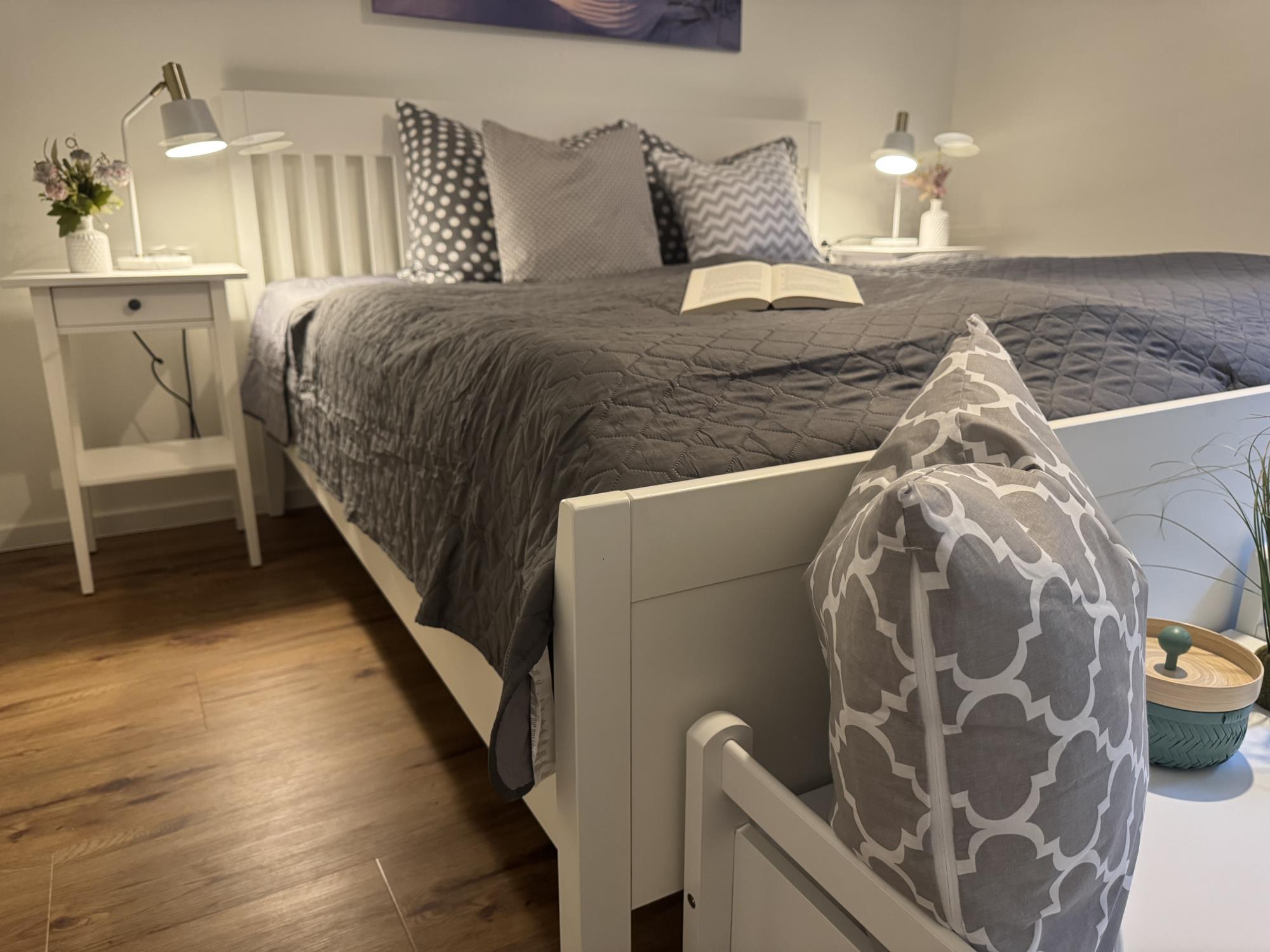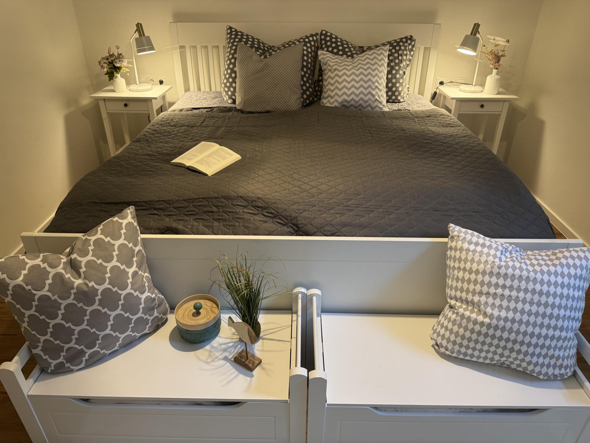 Großzügige 79qm verteilen sich auf ein Schlafzimmer mit Smart-TV und komfortablem Doppelbett (2 x 90cm x 200cm). Das andere ist mit zwei gemütlichen Einzelbetten (je 90cm x 200cm) ausgestattet.