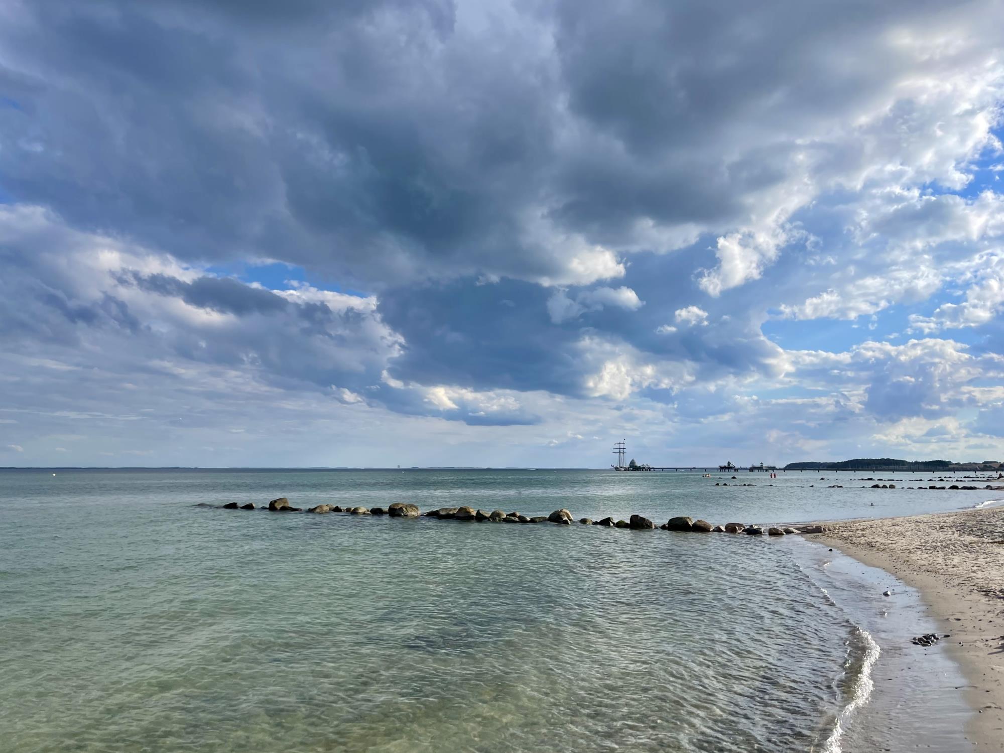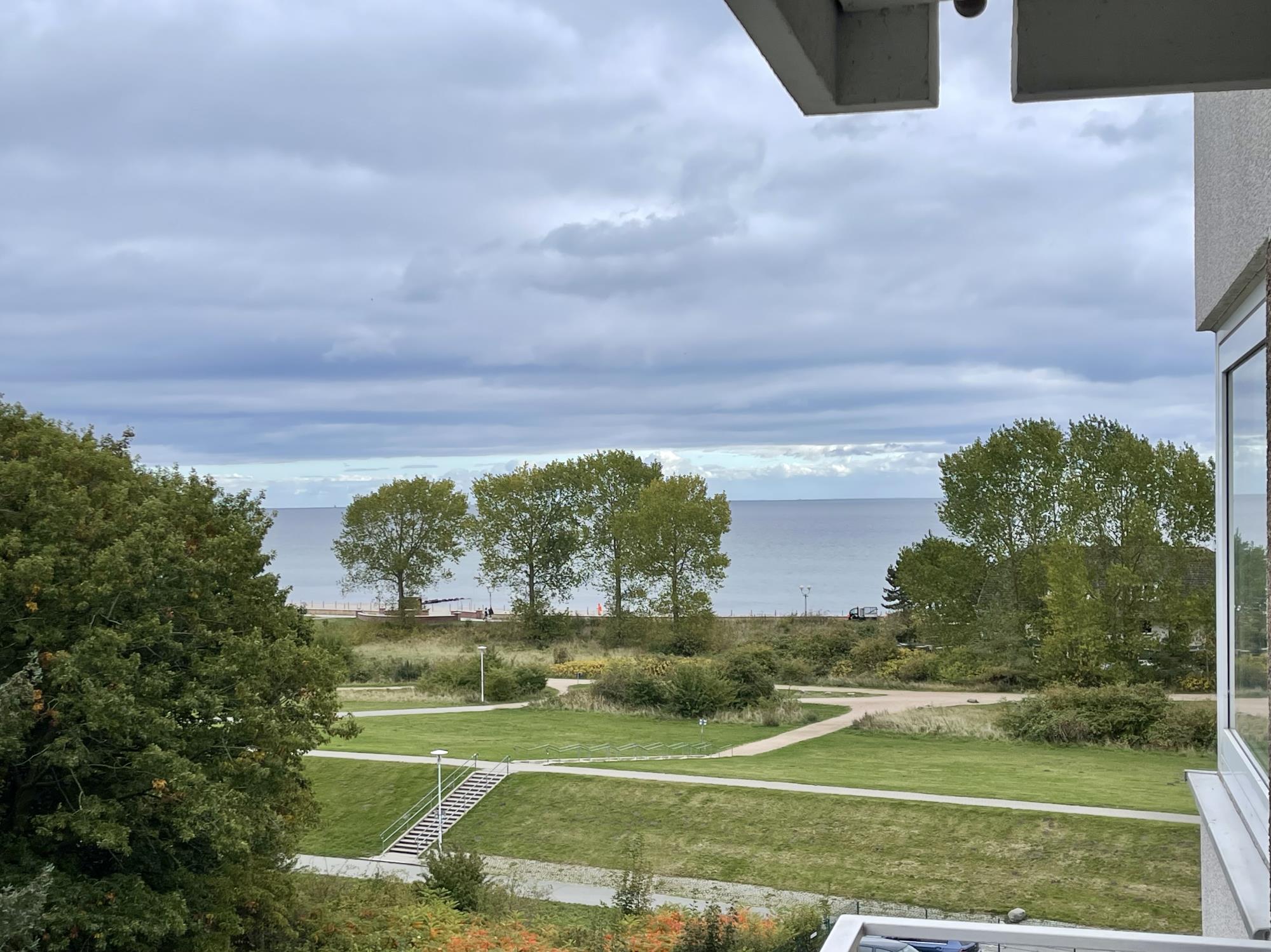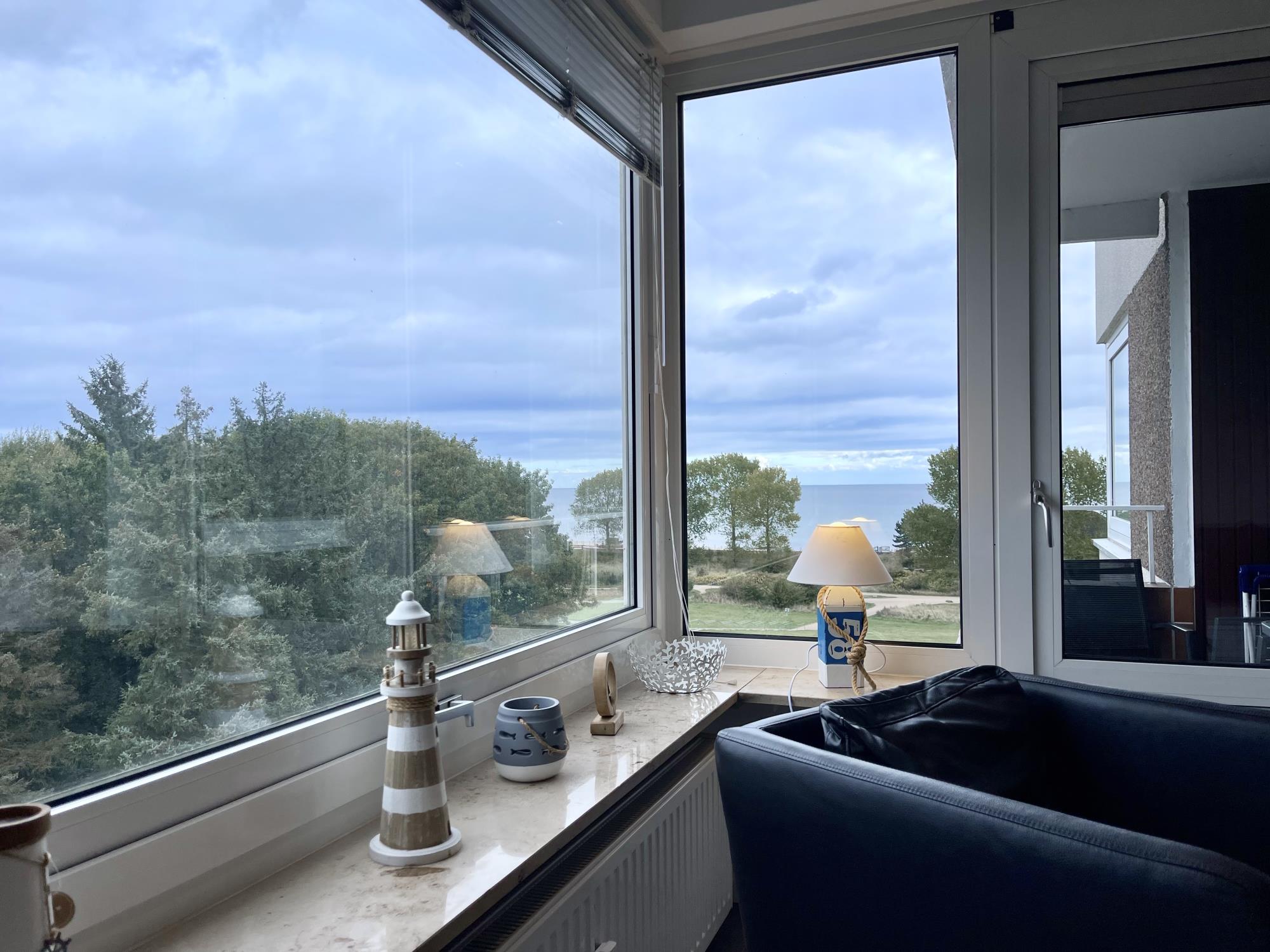 Vom Wohnzimmer und dem Balkon kannst Du auf die Ostsee schauen.