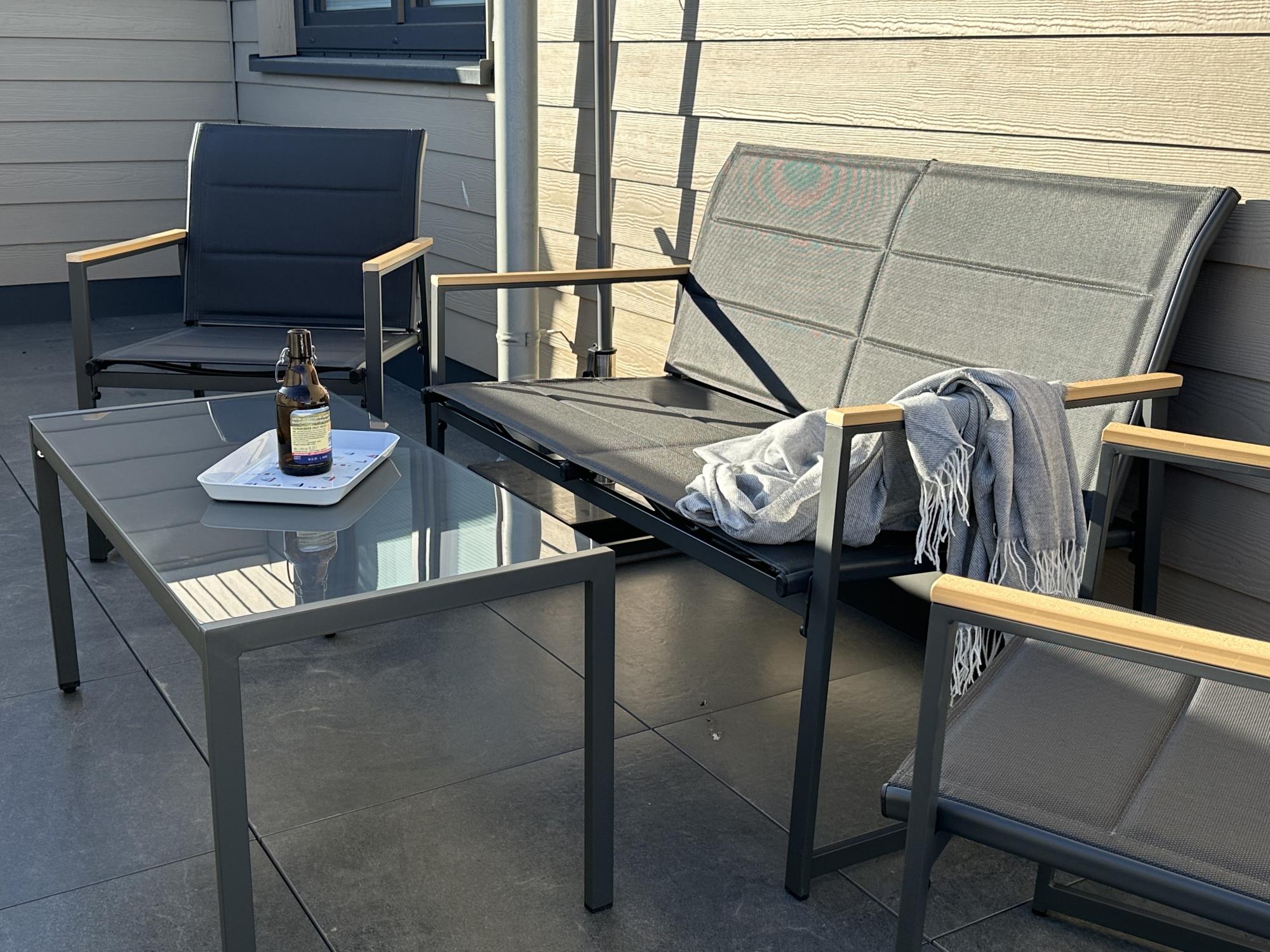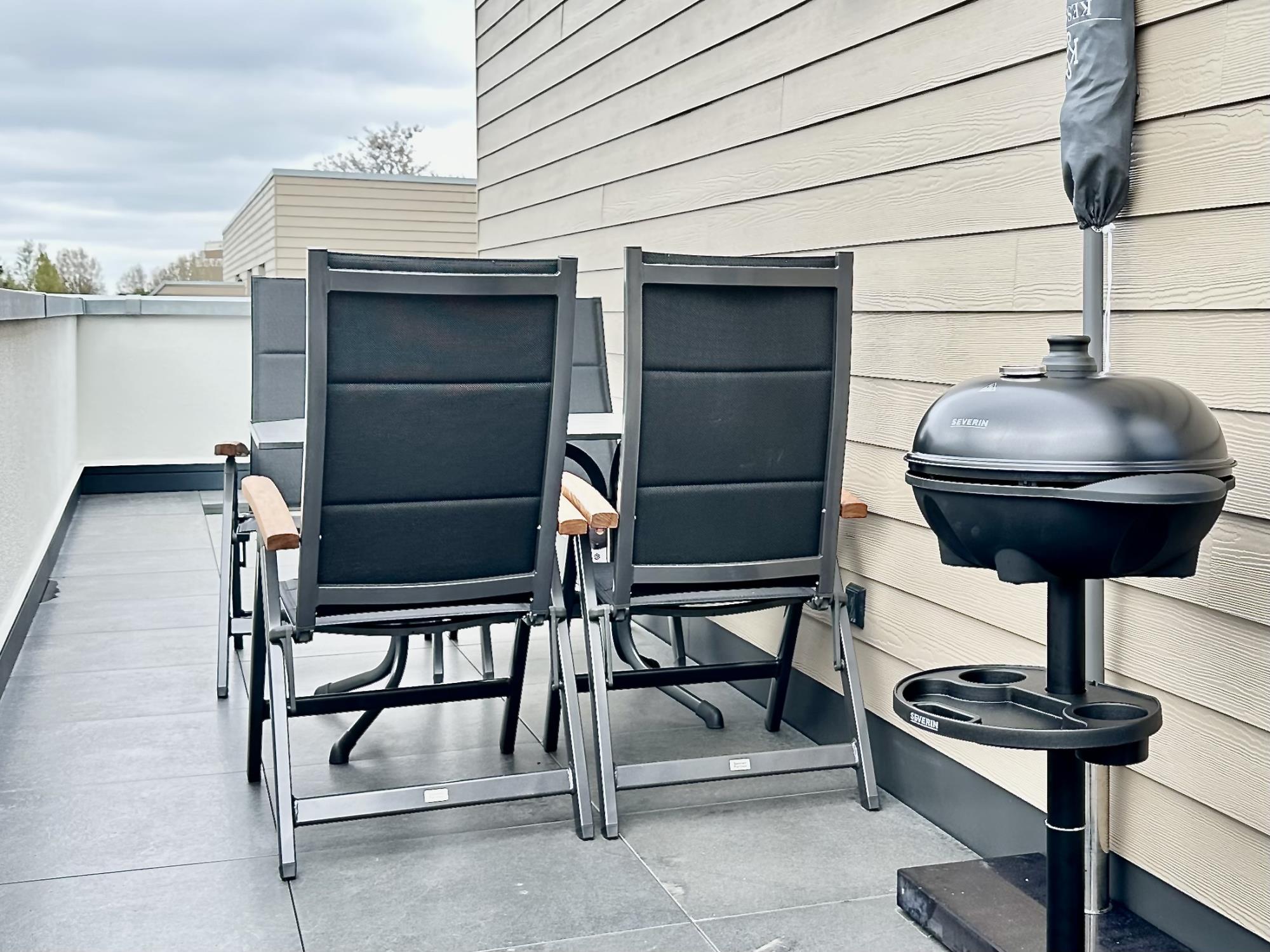 Saison- und witterungsabhängig, ca. April bis Oktober, stehen Garten- und Loungemöbel sowie der Grill zur Verfügung.