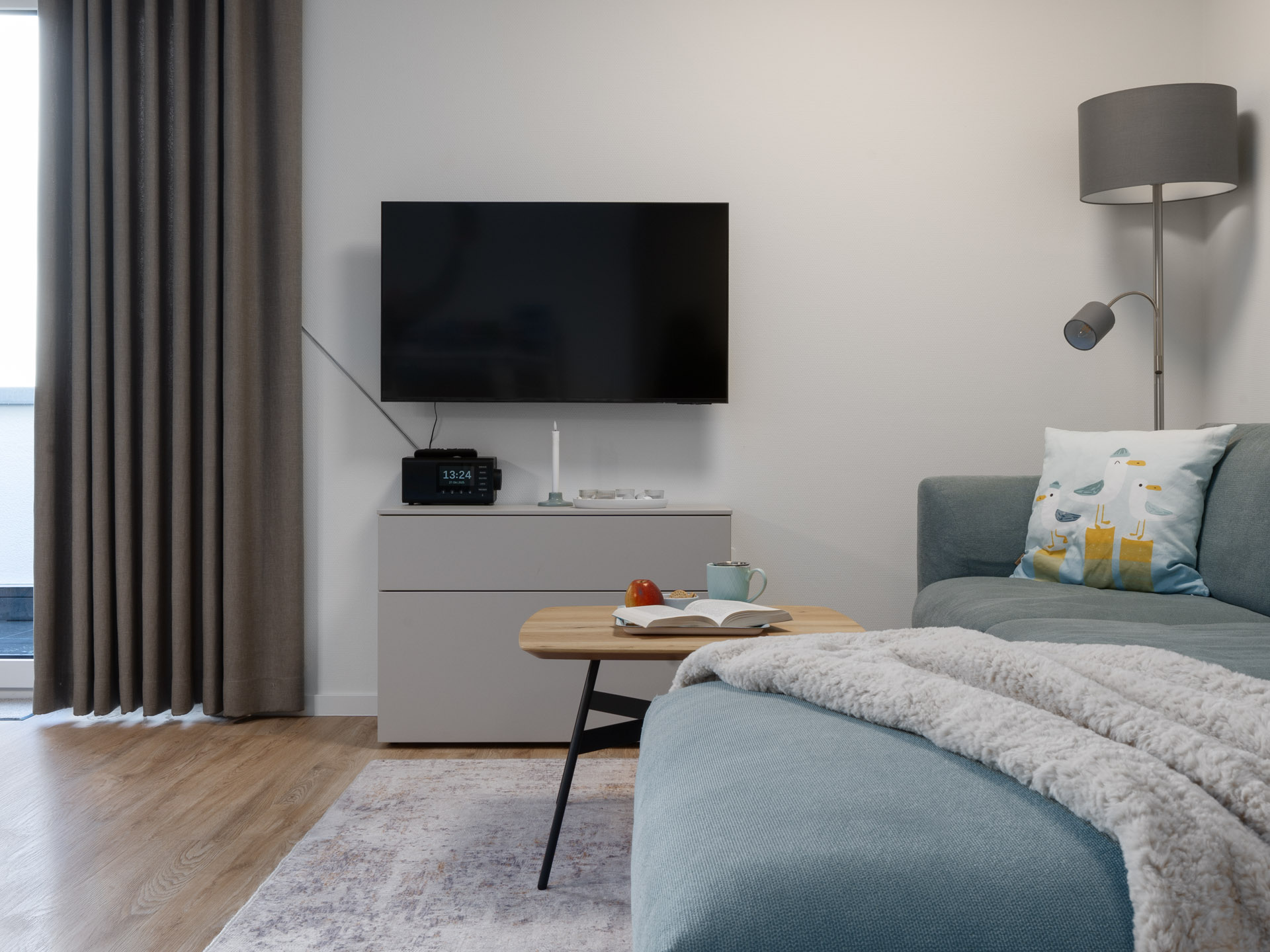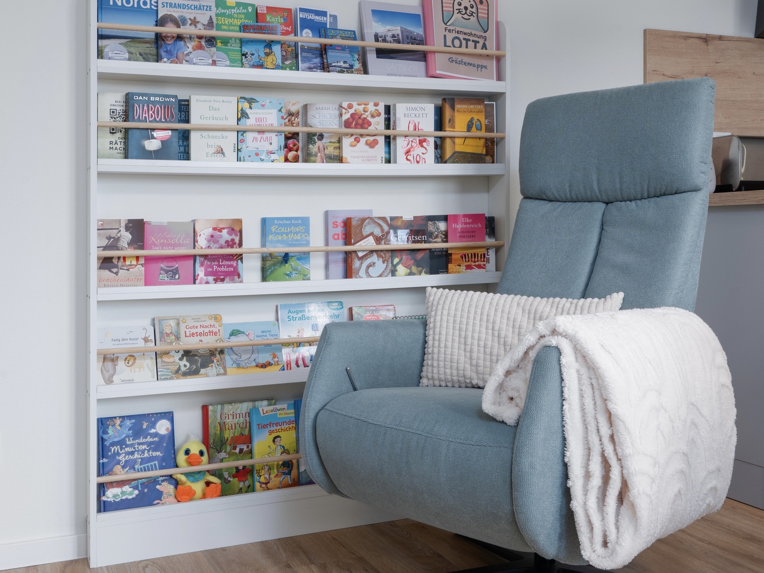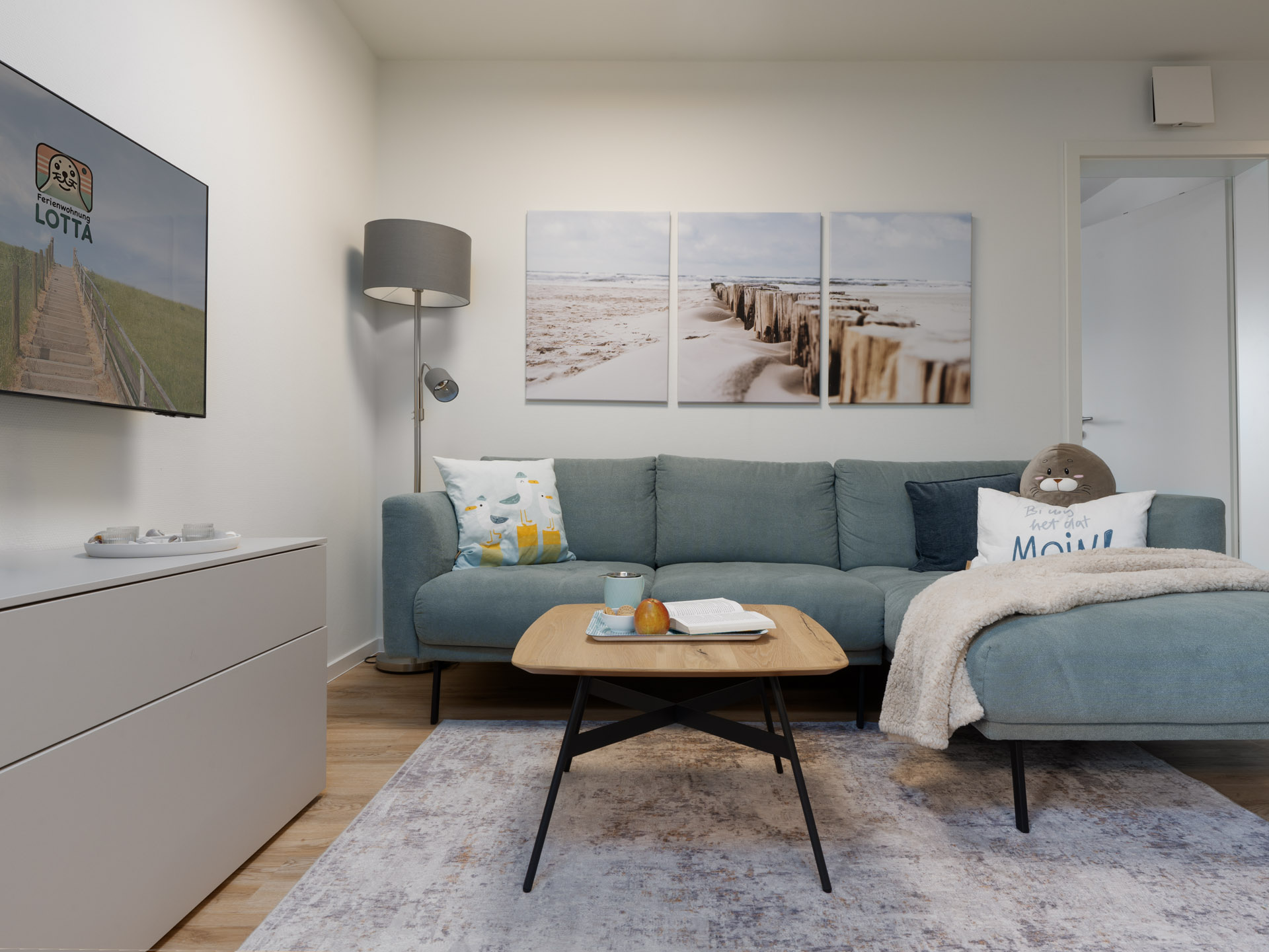 Die Fewo LOTTA begeistert uns mit einem nordisch-frischen Einrichtungskonzept. Von A, wie Milchaufschäumer bis Z, wie Kinderbesteck findet ihr hier sogar einen Ventilator, einen Bollerwagen und einen abschließbaren Fahrradraum, in dem ihr auch euer E-Bike laden könnt. Ein Kfz-Stellplatz ist bei Anmietung der Ferienwohnung LOTTA in Tossens grundsätzlich inklusive.